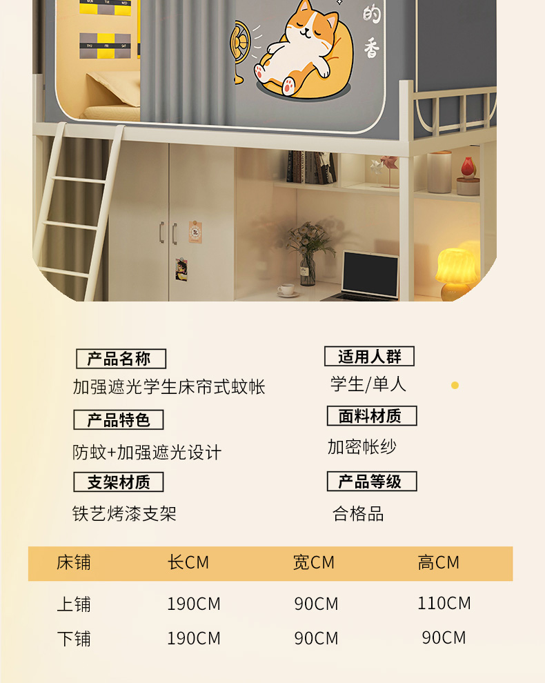 90上下铺通用(带靠墙帘):90宽x190长x90-120高(高度伸缩) | ¥105.00 |