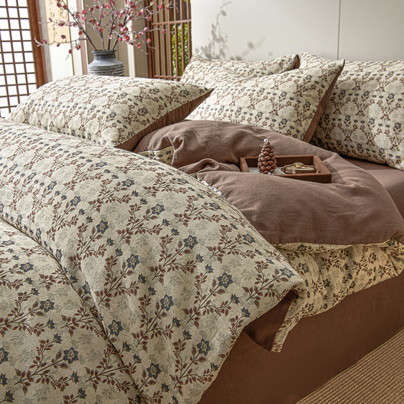 绘萱家居 2026新款纯棉+麻棉麻全棉印花四件套 枝蔓轻语
