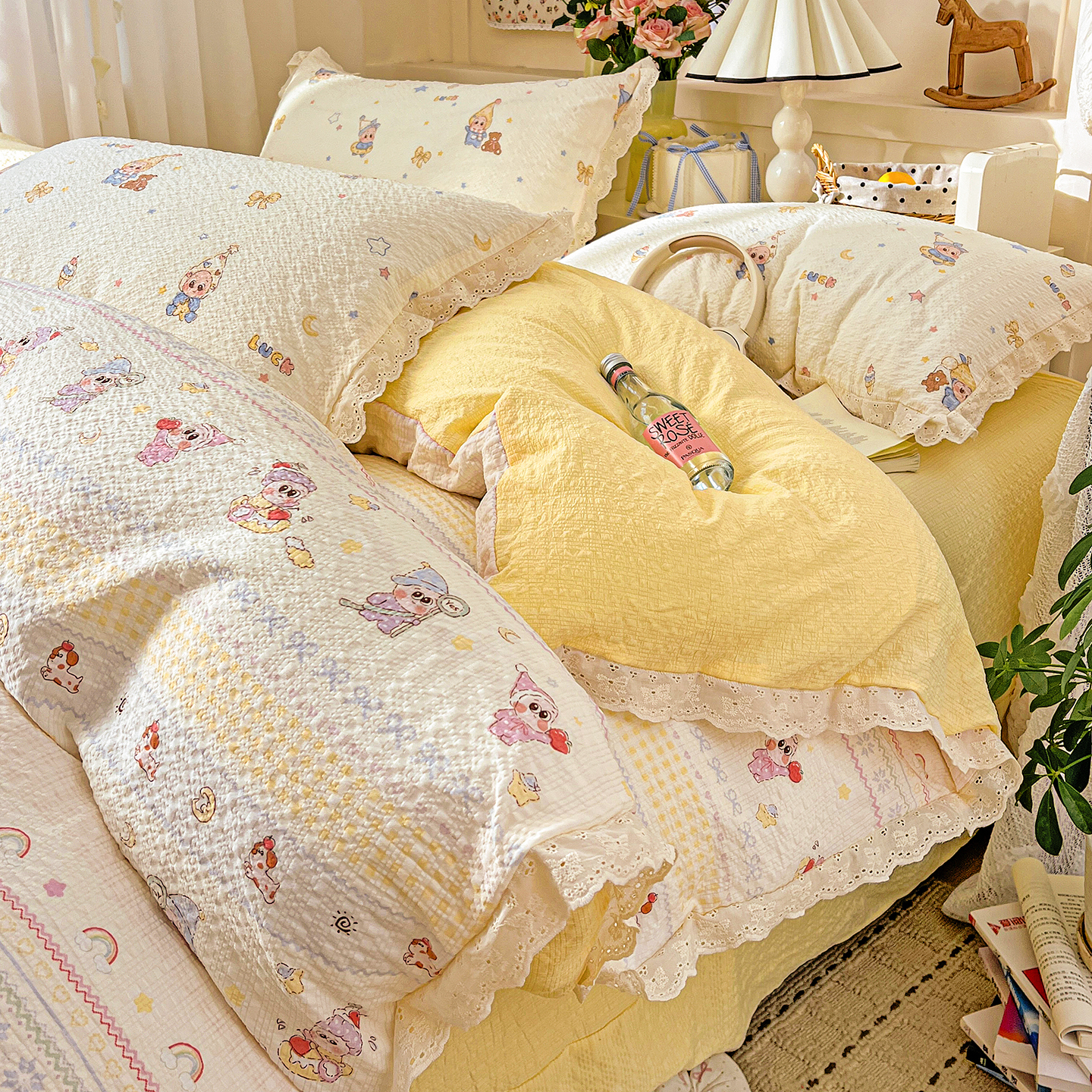 (总)一比一家纺 2026新款泡芙纱花边四件套,捕梦星人 - 黄,捕梦星人 - 红,蝶屿,费尔岛狗狗,果子小象,红啵啵,红色小马,花影,花与兔,咖啡狗,萌趣小熊,喵喵日记,奶棕小马,青梅酱,清雅,情书,小欢喜,小黄人,心愿,樱桃布丁,紫色花田,棕熊宝贝,组合图