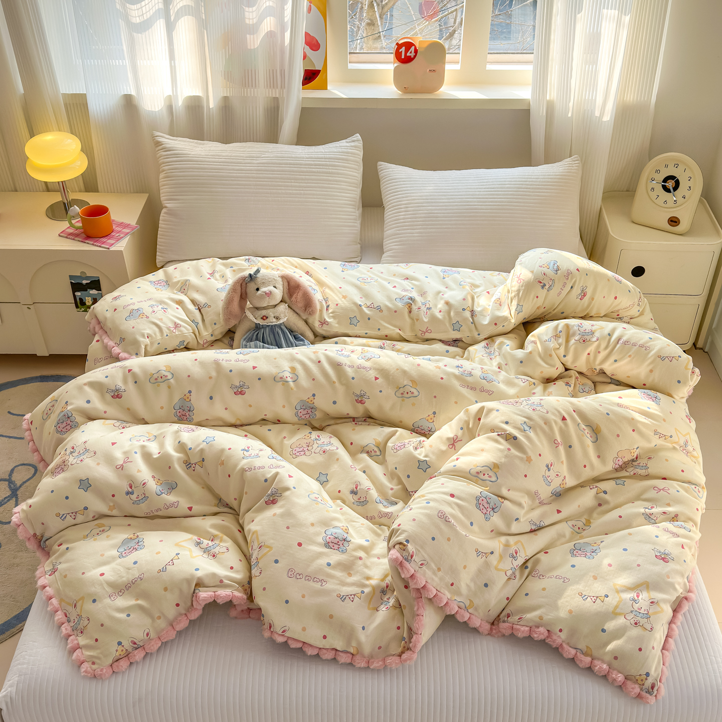 商品名称:丽涵家纺 2026新款全棉双层纱毛球花边单品被套 小熊郊游