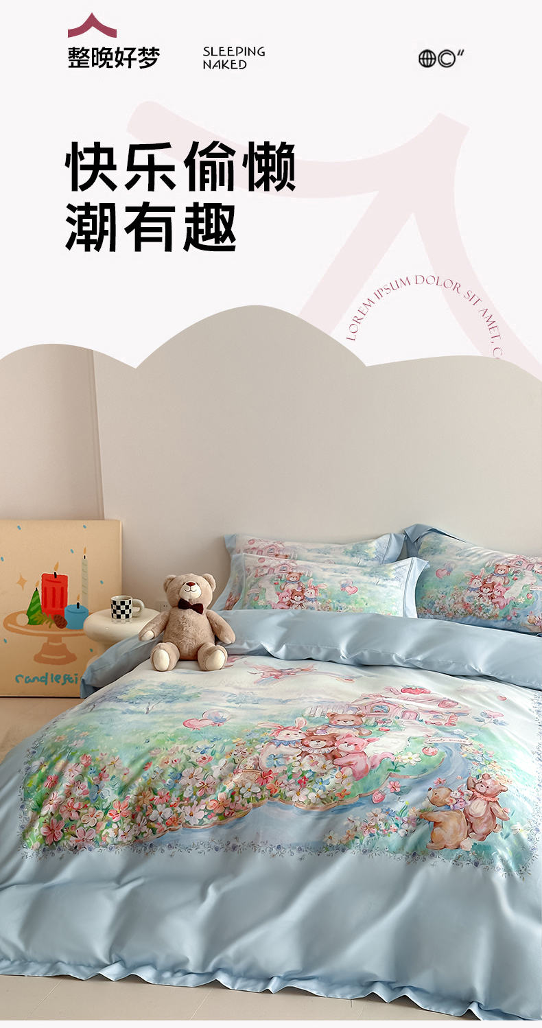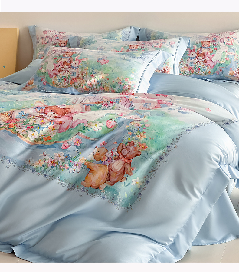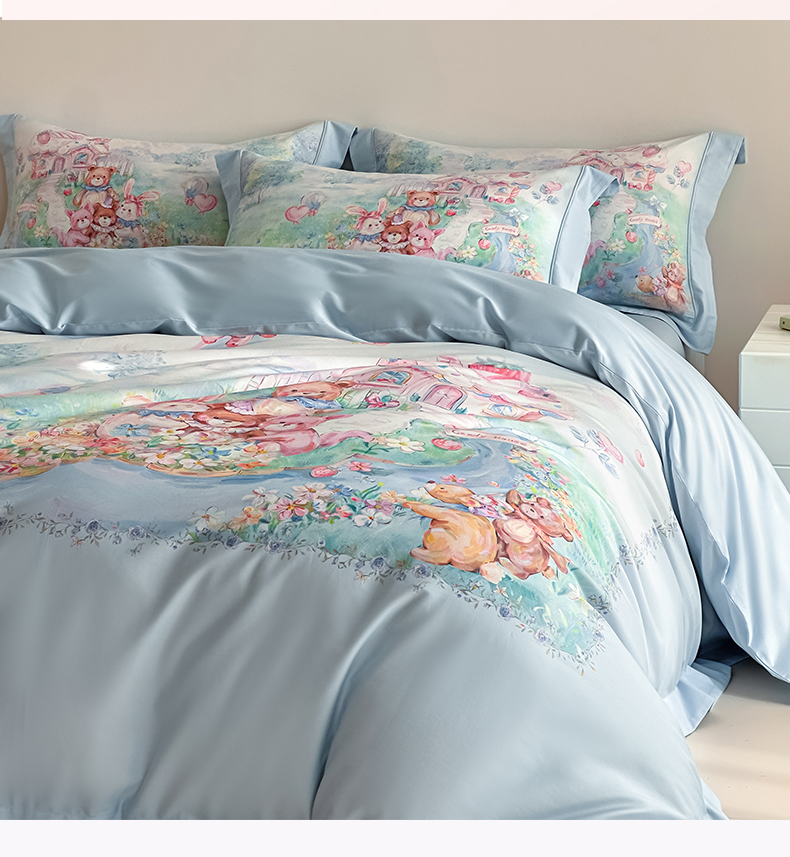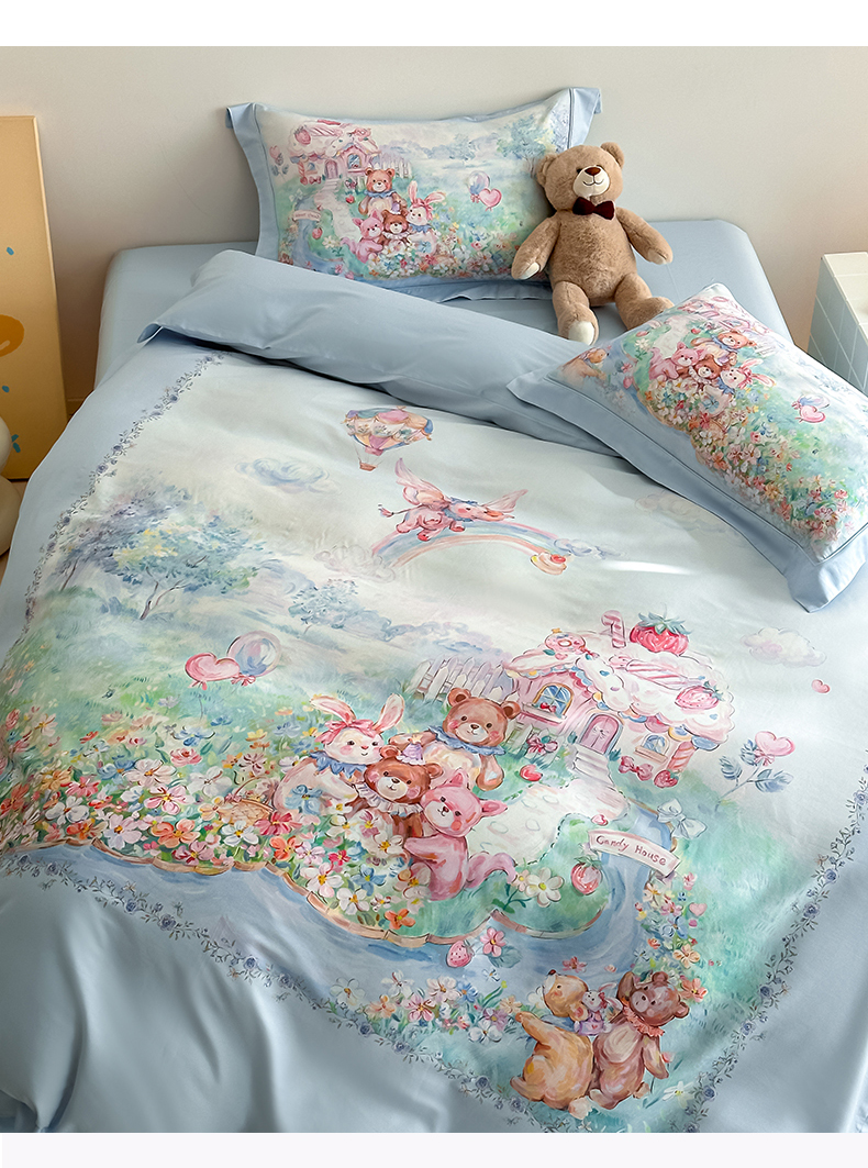 U品汇 2026新品纯棉全棉平网大版数码印花四件套高端60支长绒棉贡缎埋绳宽边系列 彩虹派对(蓝)