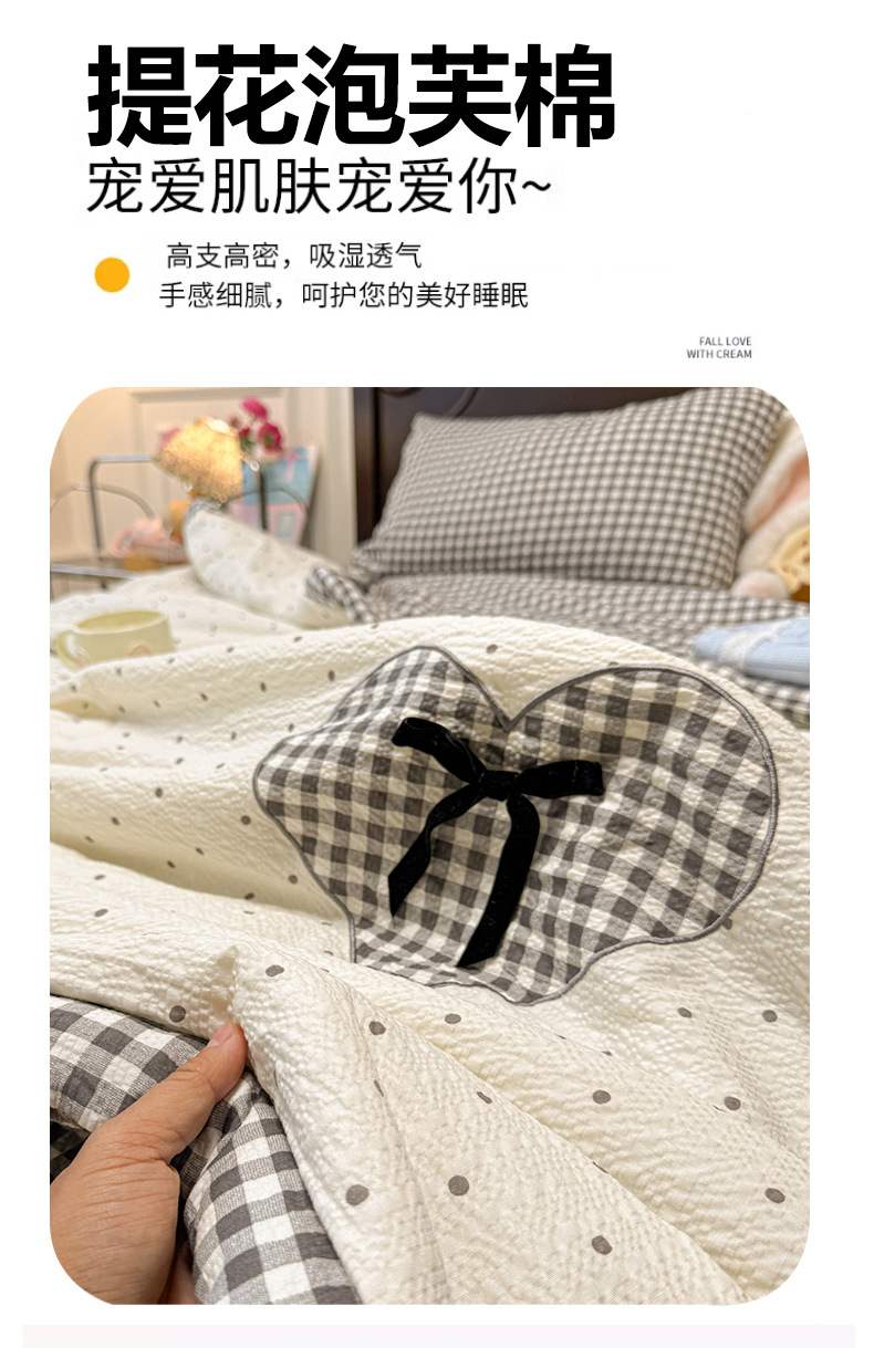 • 91家纺网 家纺一手货源 找家纺 瑞禾家纺(原阿亮) 2026新款春夏新款提花泡芙棉贴布绣手包边单夏被夏被四件套-丘比特的爱恋 丘比特的爱恋-奶黑波点+黑小格