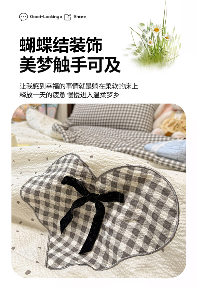 当前位置: 91家纺网 > 商品网购 > 被子 > 夏被 > 瑞禾家纺(原阿亮) 2026新款春夏新款提花泡芙棉贴布绣手包边单夏被夏被四件套-丘比特的爱恋 丘比特的爱恋-奶黑波点+黑小格