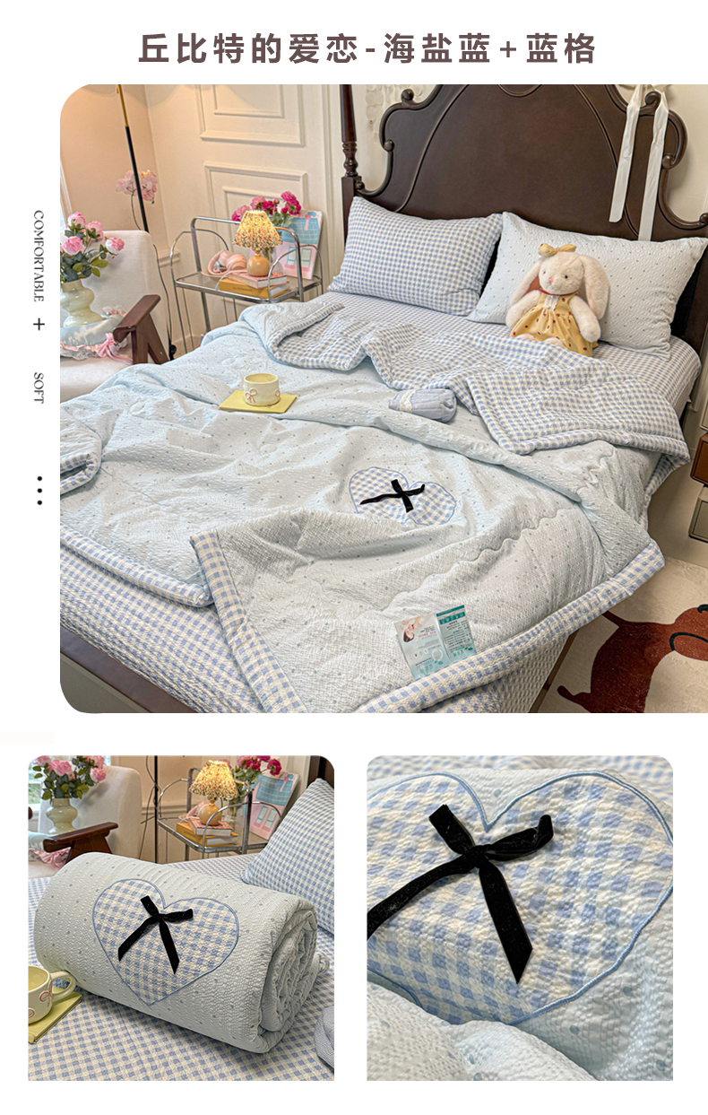 (总)瑞禾家纺(原阿亮) 2026新款春夏新款提花泡芙棉贴布绣手包边单夏被夏被四件套-丘比特的爱恋,丘比特的爱恋-海盐蓝+蓝格,丘比特的爱恋-奶粉波点+粉波点,丘比特的爱恋-奶黑波点+黑小格,丘比特的爱恋-奶红波点+红格,组合图仅供展示-不可下单