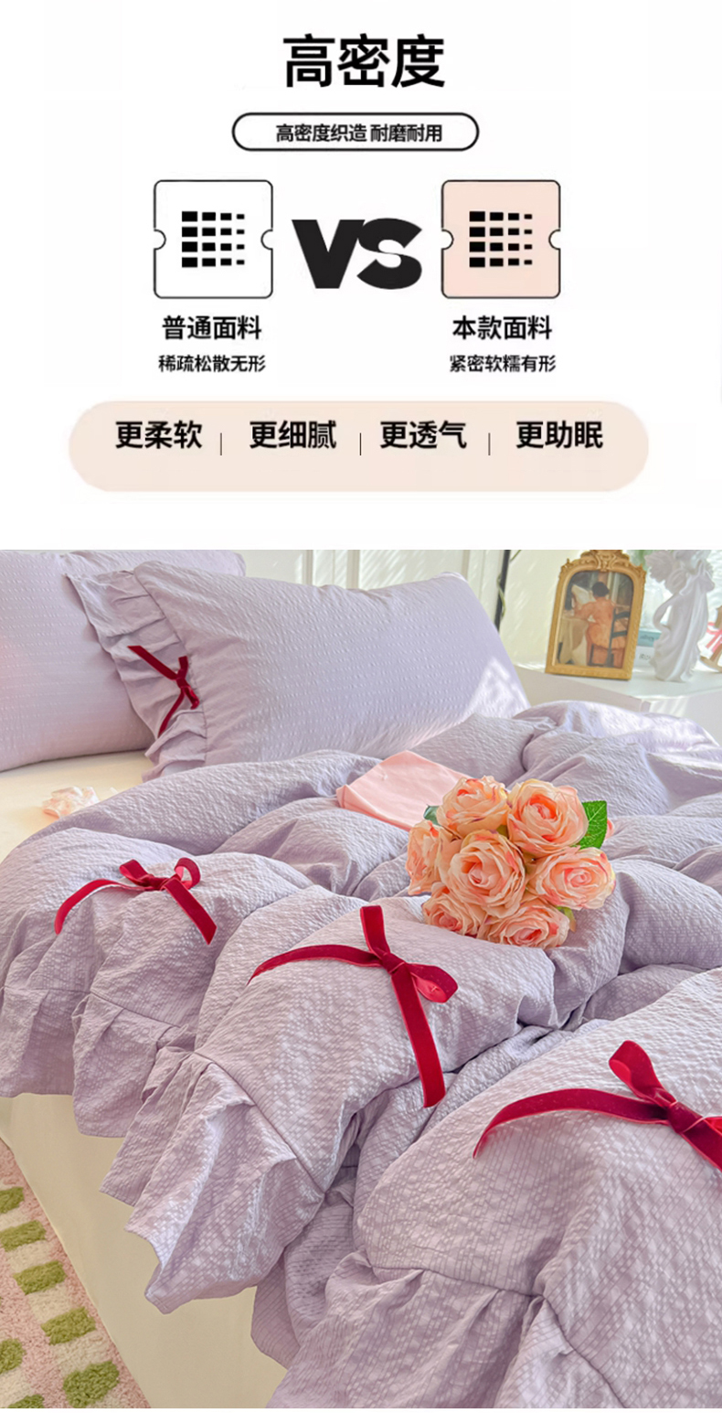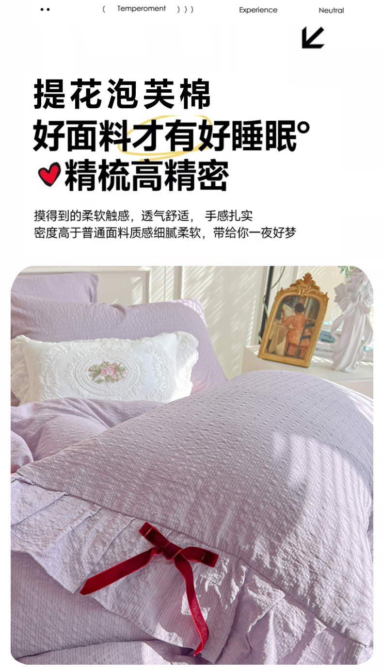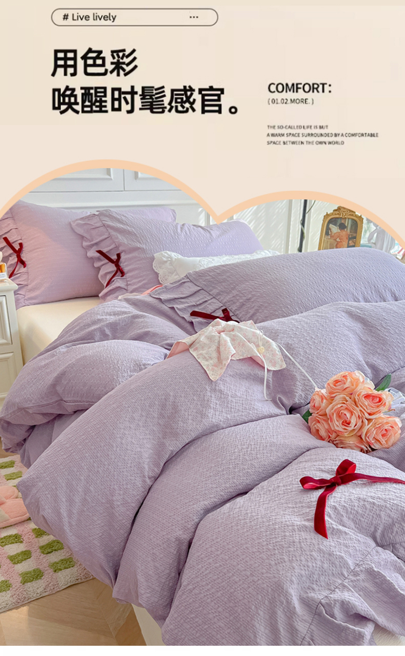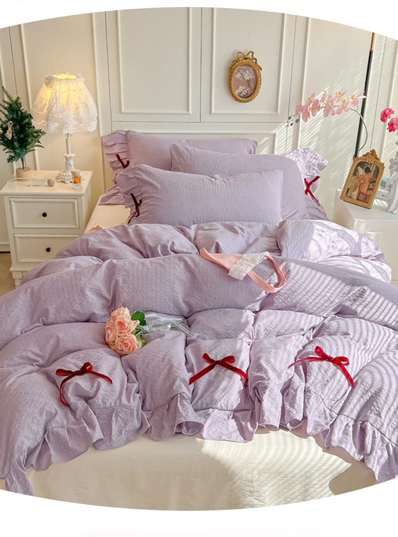当前位置: 91家纺网 > 商品网购 > 床品套件 > 四件套 > 其它四件套 > 瑞禾家纺(原阿亮) 2026春夏新款提花泡芙棉花边蝴蝶结床单床笠四件套-甜心公主 甜心公主-阳光紫