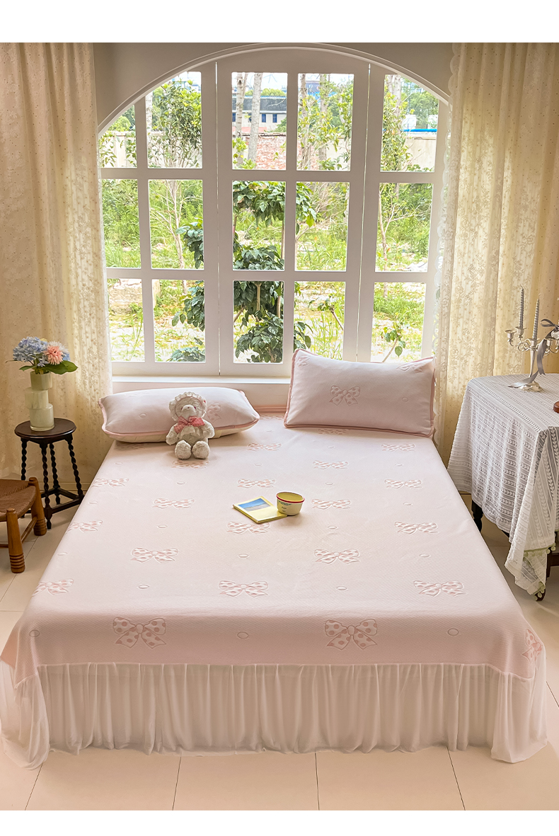 商品名称:悦织湾家纺 2026新款提花凉豆豆凉席三件套夏季3D豆豆席冰爽席子床裙款蝴蝶结小熊系列 床裙款-蝴蝶结粉