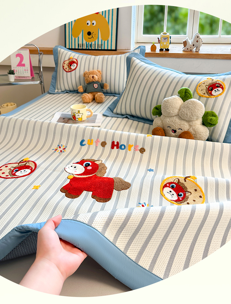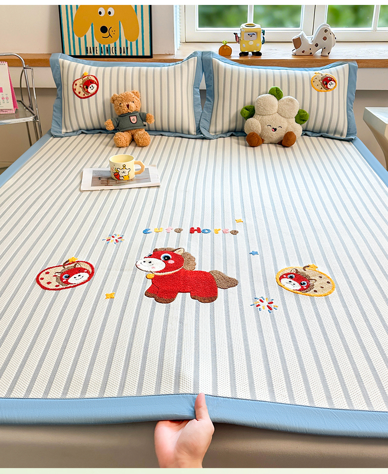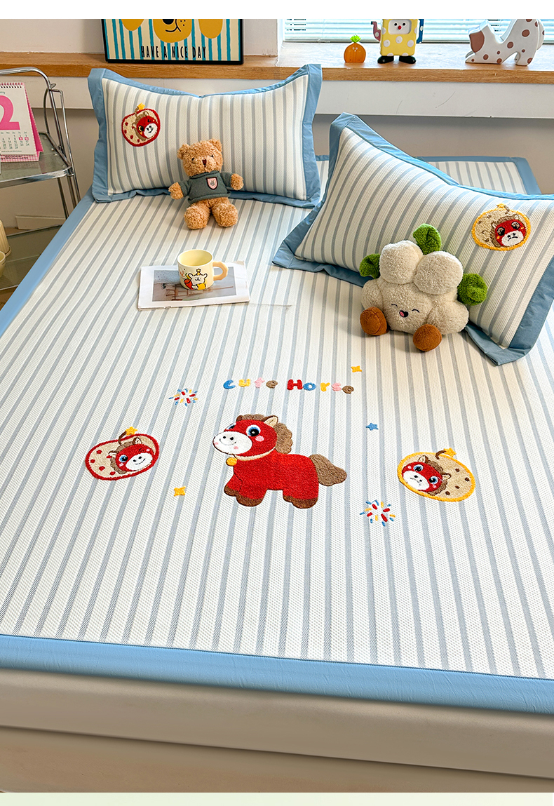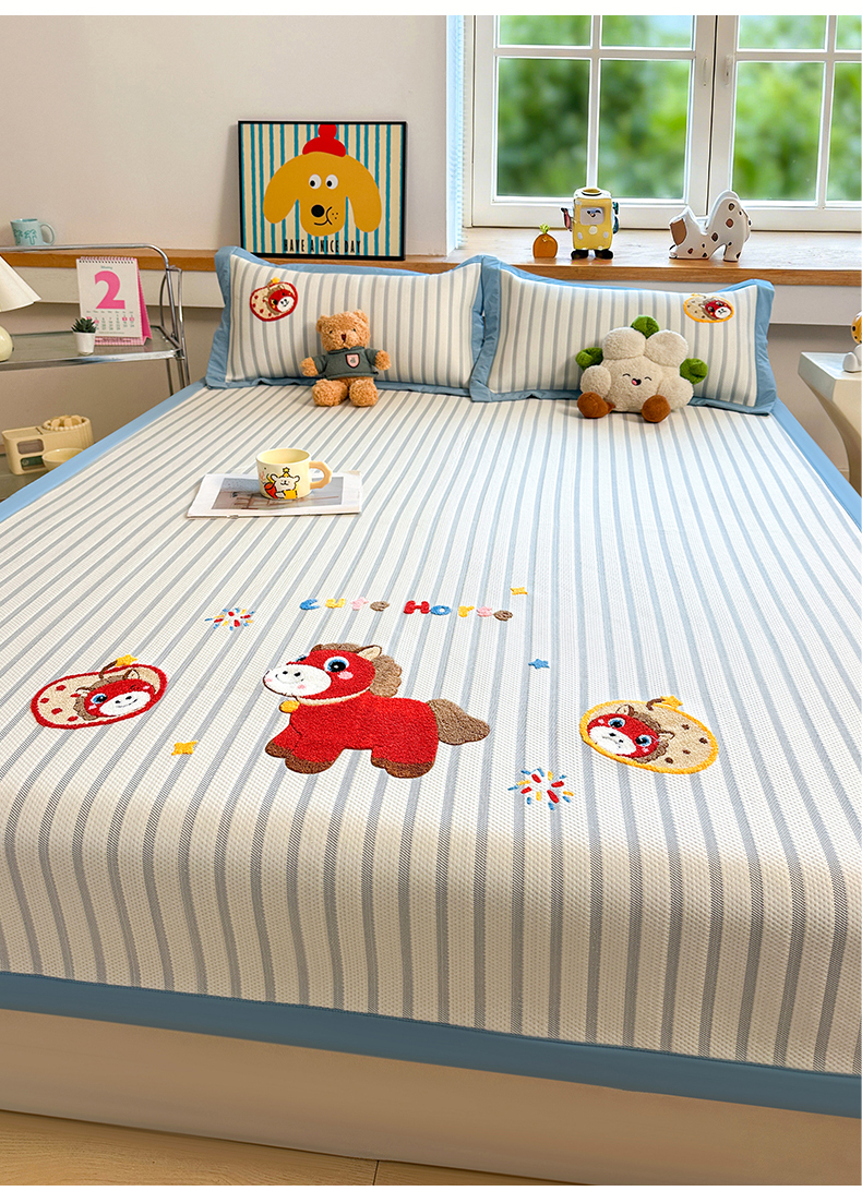 商品名称:雯豆家纺 2026新款PE中分子毛巾绣凉席三件套平铺席子卡通绣花条席 发财小马-蓝