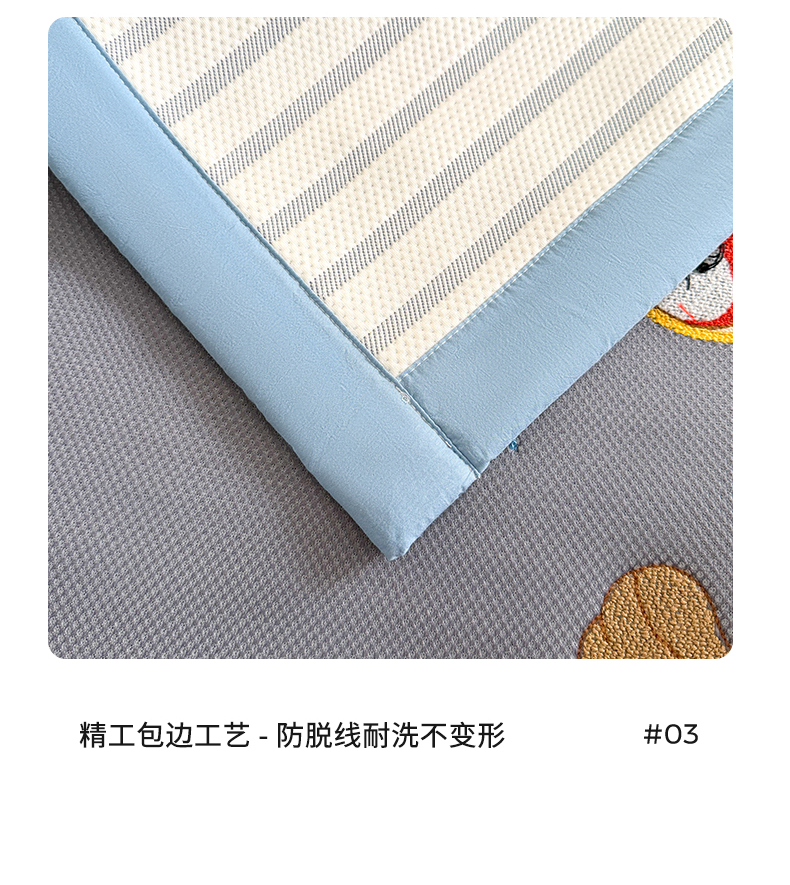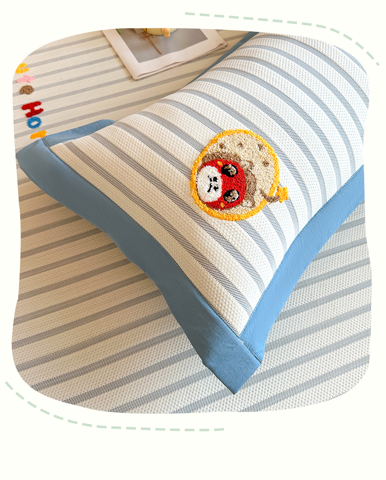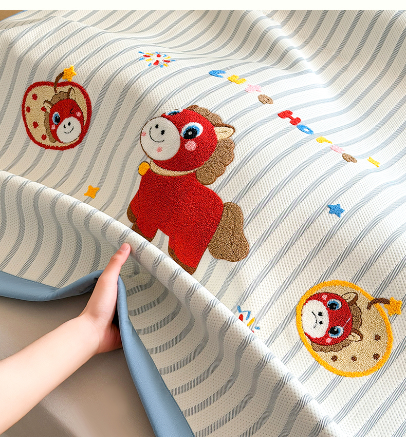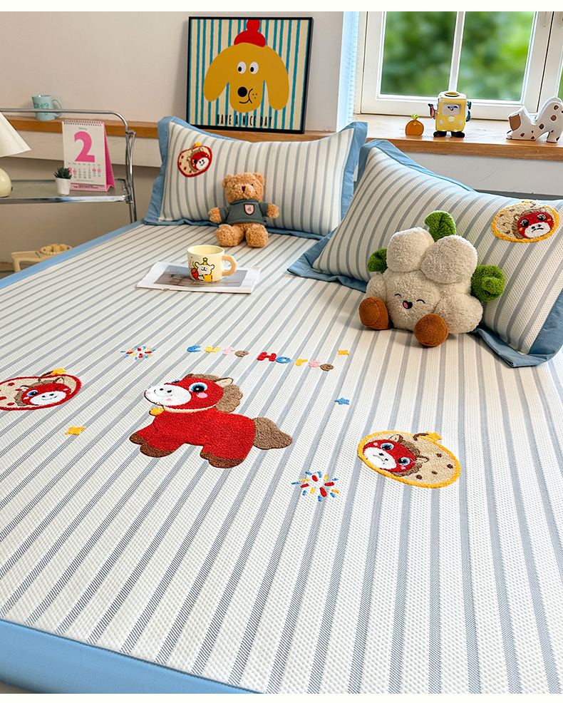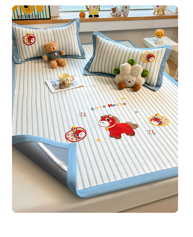 商品名称:雯豆家纺 2026新款PE中分子毛巾绣凉席三件套平铺席子卡通绣花条席 发财小马-蓝