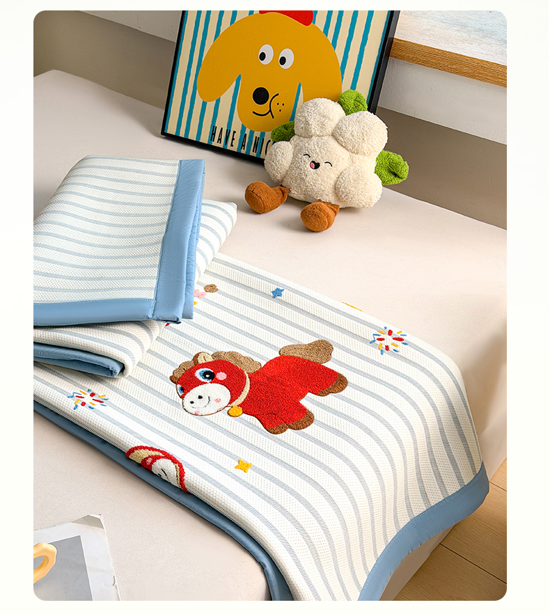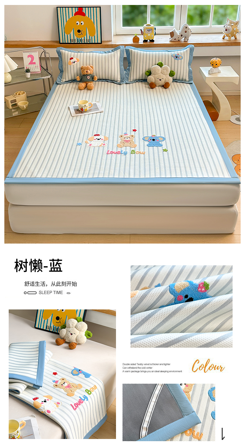 雯豆家纺 2026新款PE中分子毛巾绣凉席三件套平铺席子卡通绣花条席 发财小马-蓝