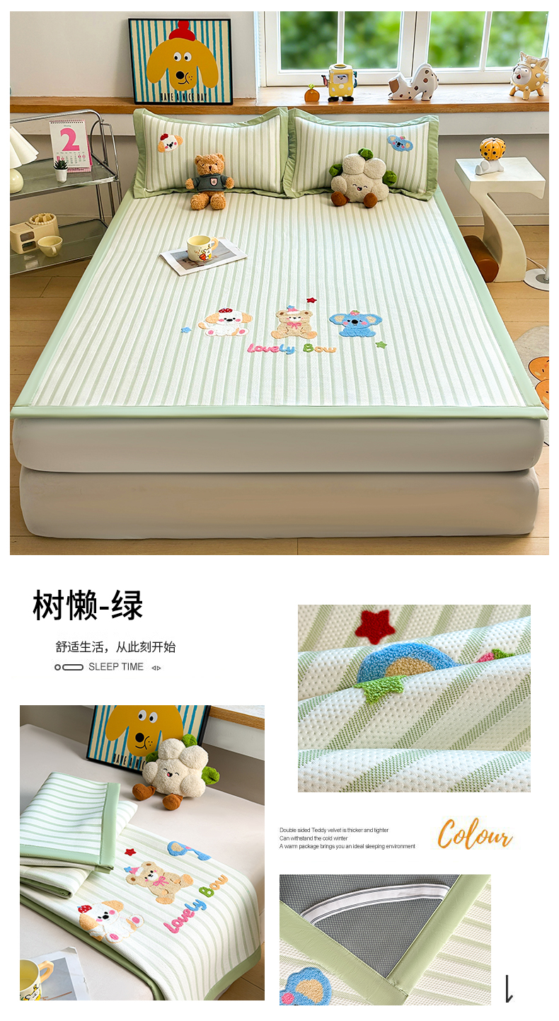 (总)雯豆家纺 2026新款PE中分子毛巾绣凉席三件套平铺席子卡通绣花条席,奔腾小马-蓝,奔腾小马-粉,发财小马-蓝,发财小马-绿,恐龙鸭-蓝,恐龙鸭-绿,软糖小KT-粉,软糖小KT-绿,三色熊-蓝,三色熊-绿,树懒-蓝,树懒-绿