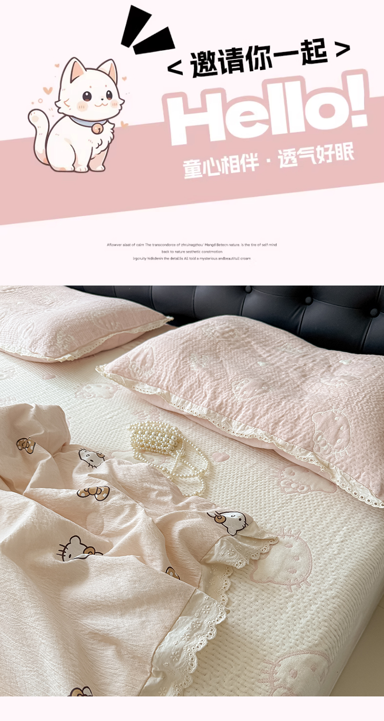 • 91家纺网 家纺一手货源 找家纺 盼季家纺 2026新款A类木棉皱皱纱床盖夏被四件套场景一-奶盖KT 奶盖KT-粉粉
