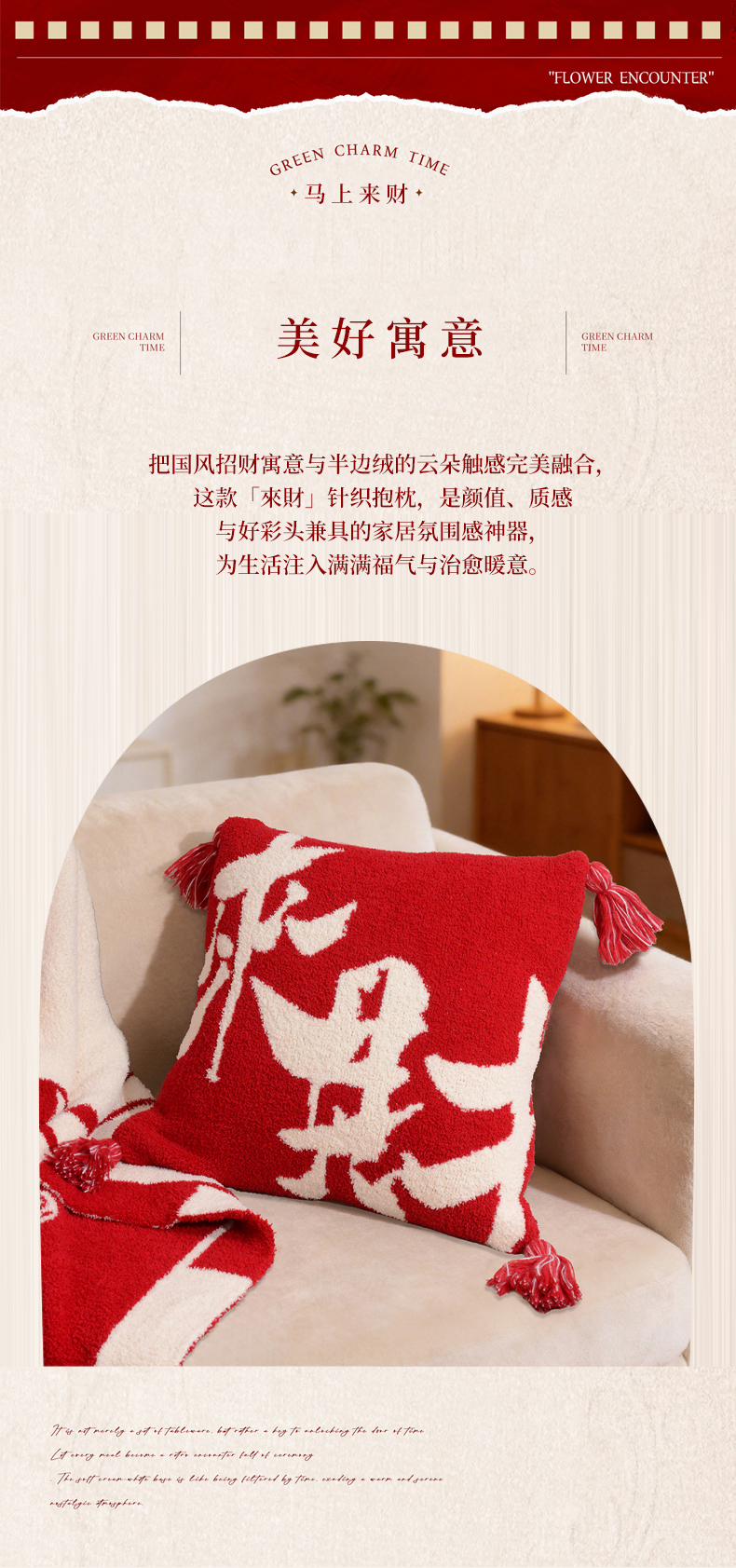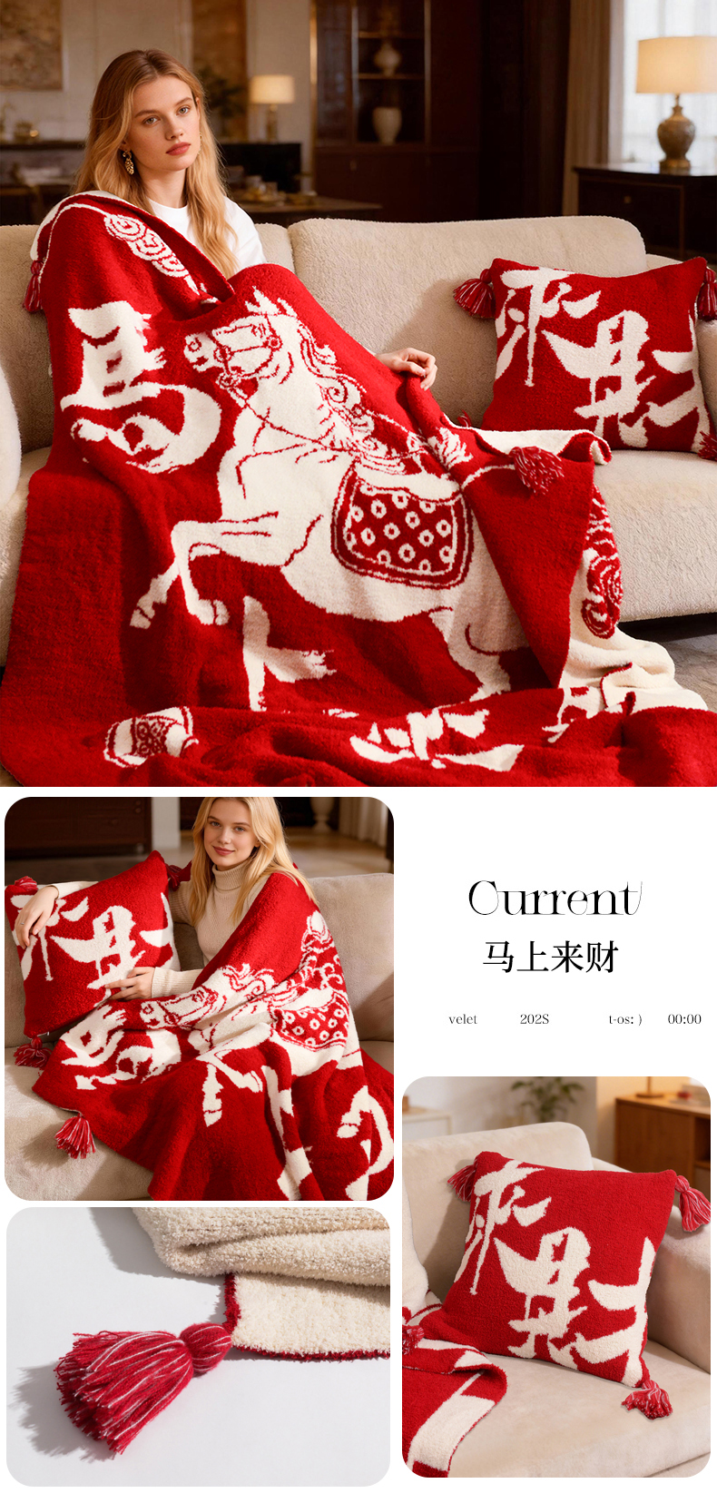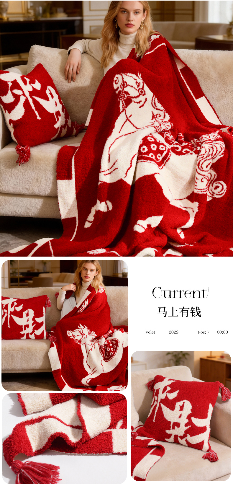 (总)苏艺针织盖毯 2026新款A类半边绒国风祥瑞针织毯披肩毛毯多功能盖毯送礼礼物,马上来财,马上有钱,马上来财抱枕套,礼盒,枕芯