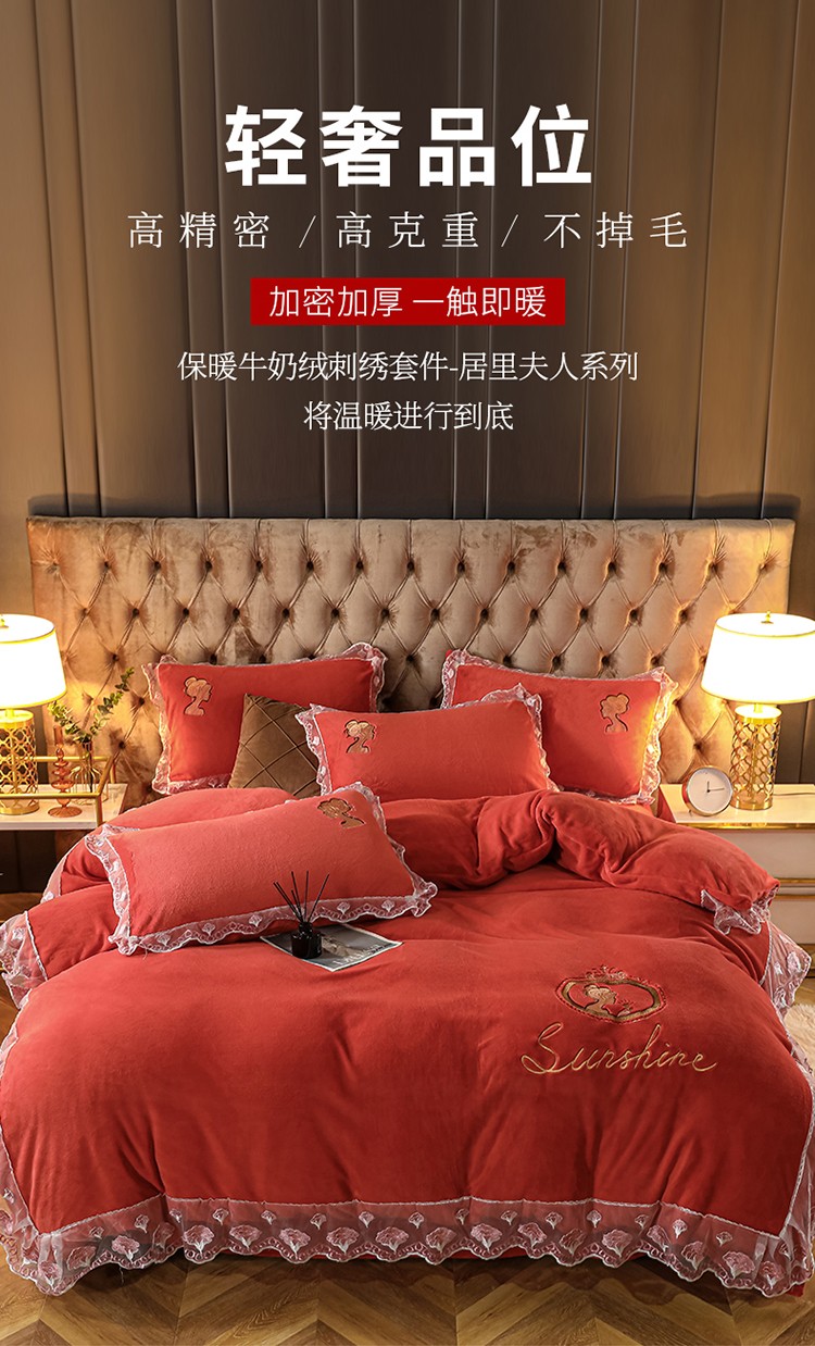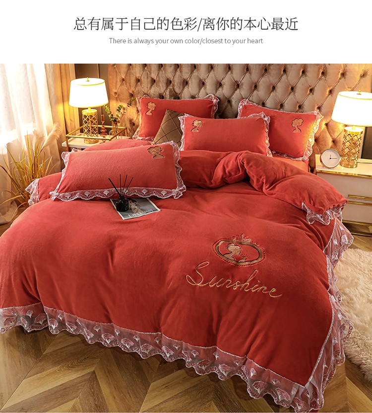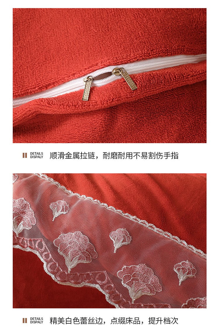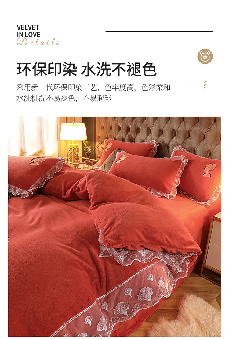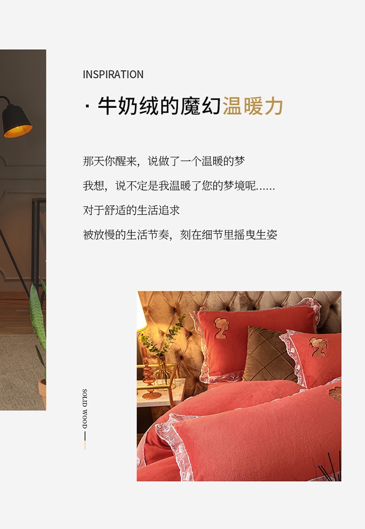 青竹苑2021新款220克加厚保暖牛奶绒刺绣蕾丝太妃款四件套 太妃桔