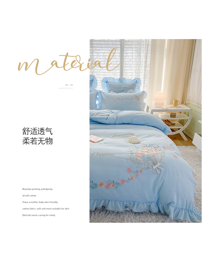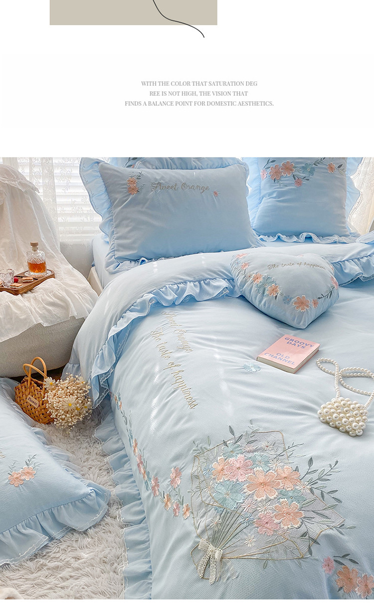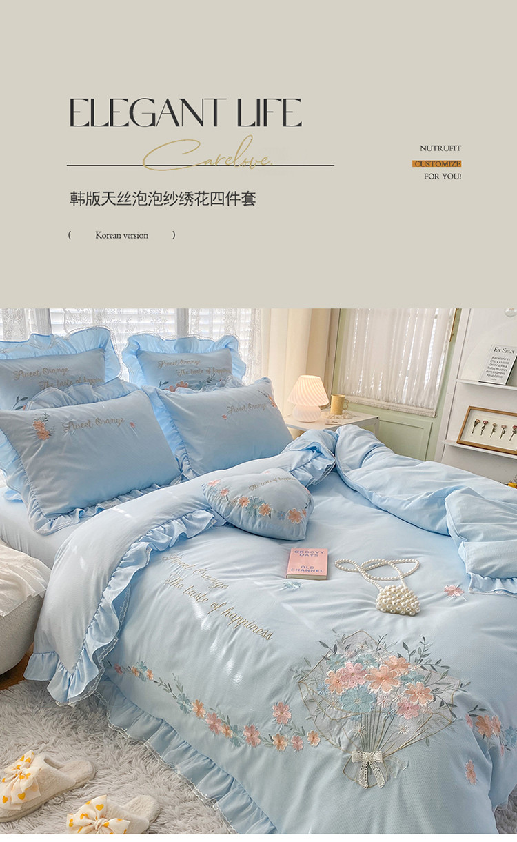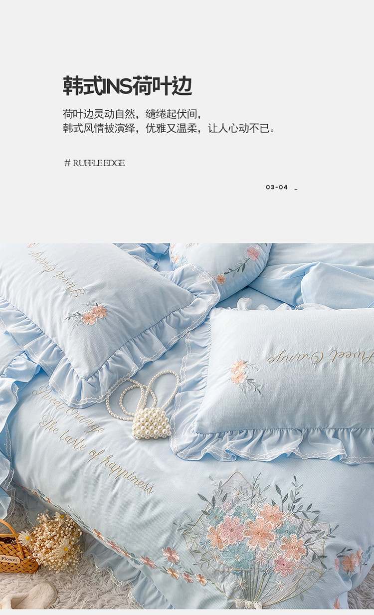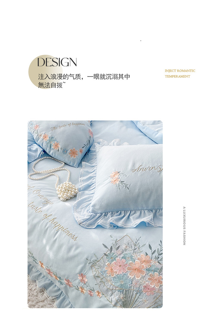 艾晶美家纺 2022新款莱赛尔天丝泡泡纱绣花四件套 巴黎春天-冰蓝