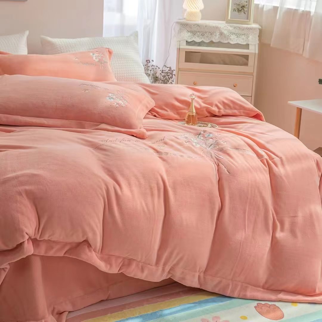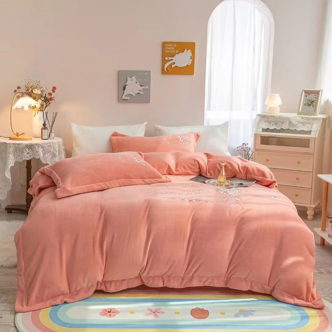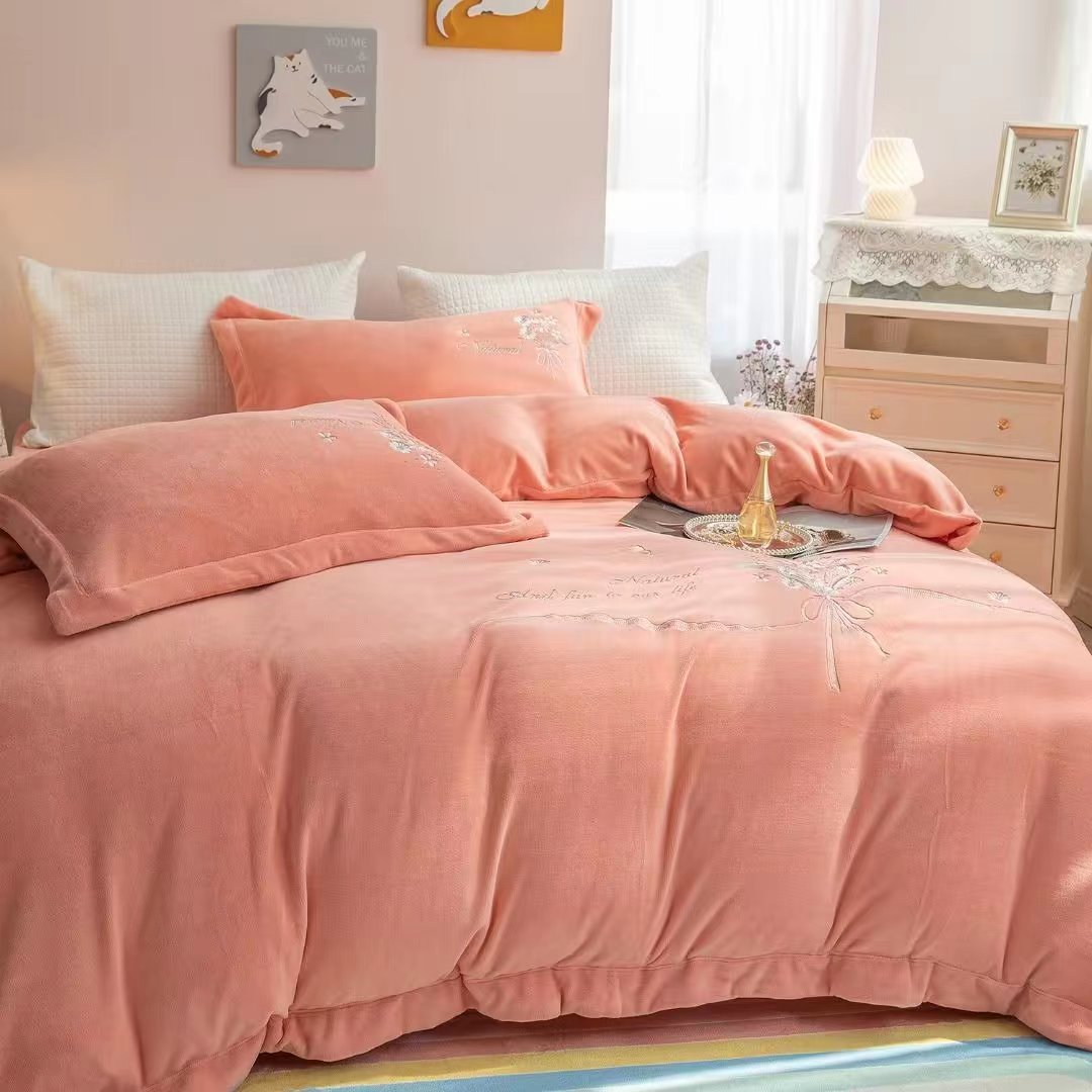 (总)绒博士 2025新款270克牛奶绒双拼角刺绣宽边款四件套--维也纳系列,维也纳-粉豆沙,维也纳-果绿,维也纳-浅咖,维也纳-浅蓝