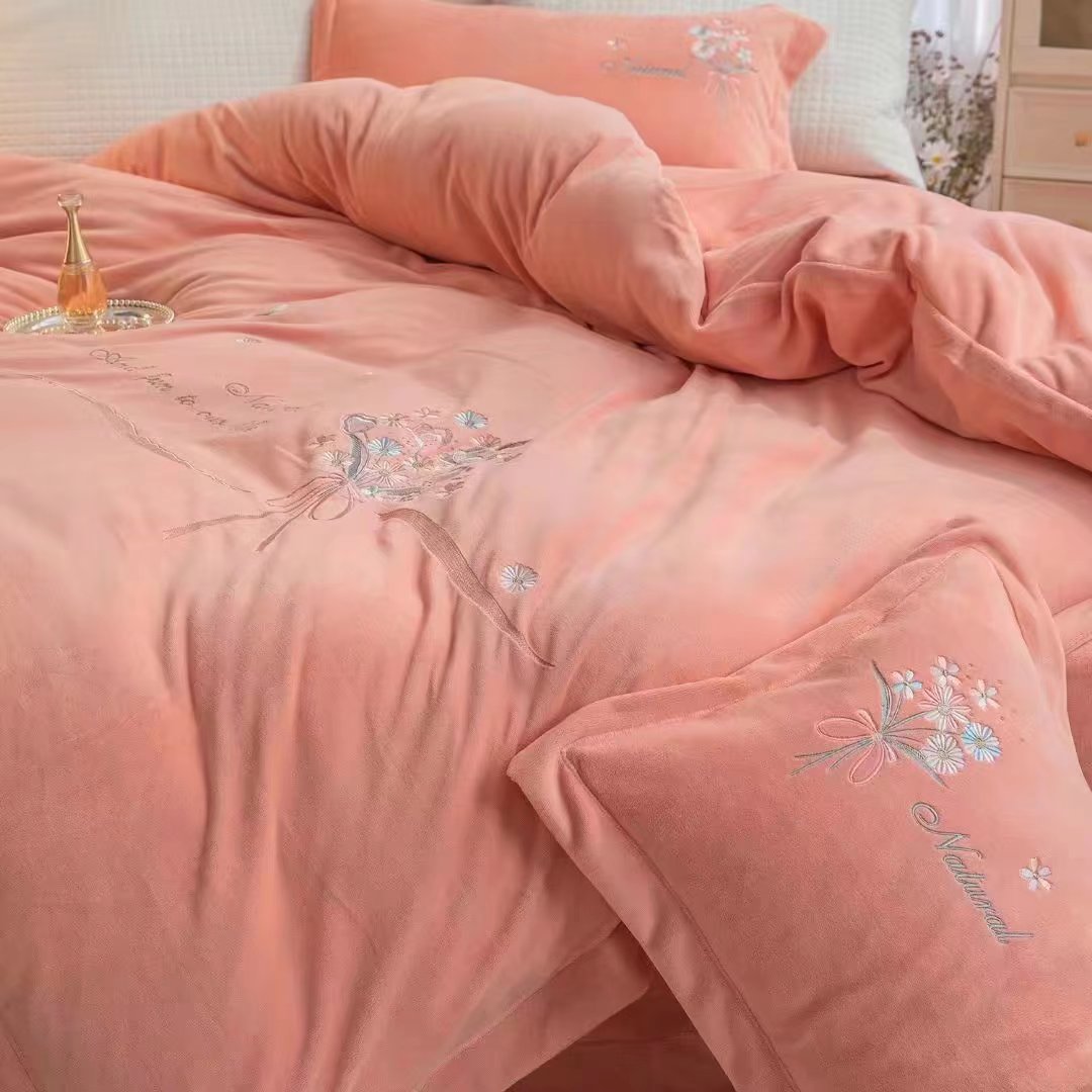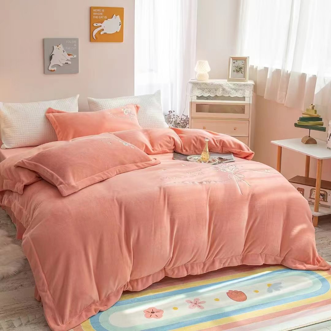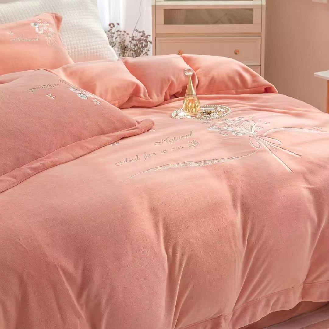 (总)绒博士 2025新款270克牛奶绒双拼角刺绣宽边款四件套--维也纳系列,维也纳-粉豆沙,维也纳-果绿,维也纳-浅咖,维也纳-浅蓝
