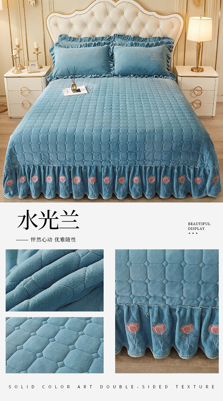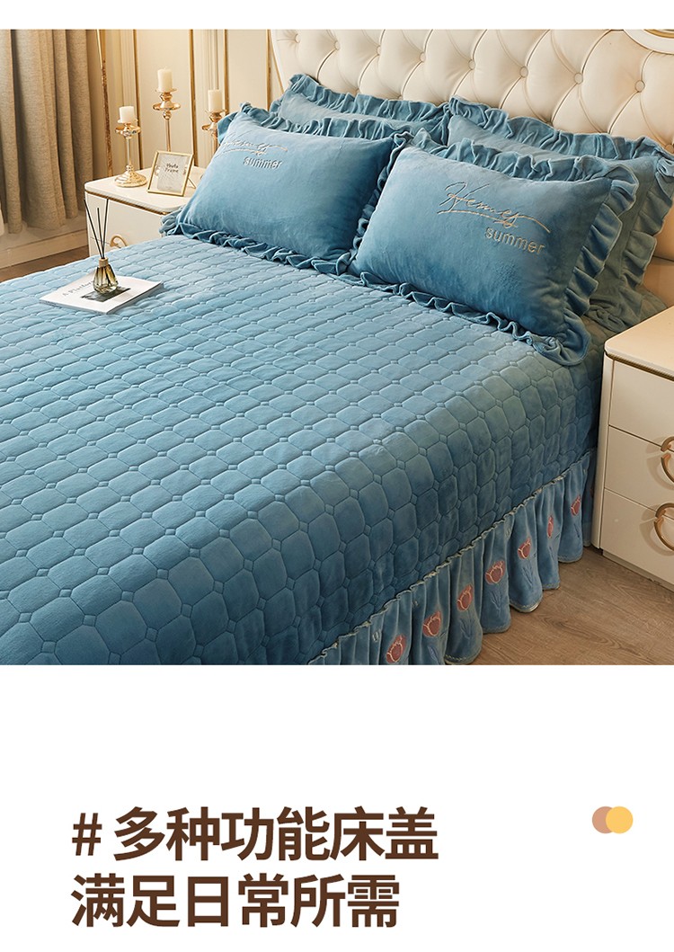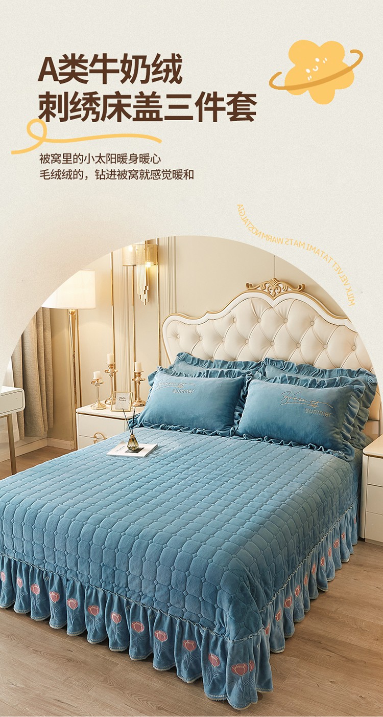 商品名称:恒爱 2022秋冬新款A类牛奶绒羽毛刺绣夹棉床盖款三件套 水光兰