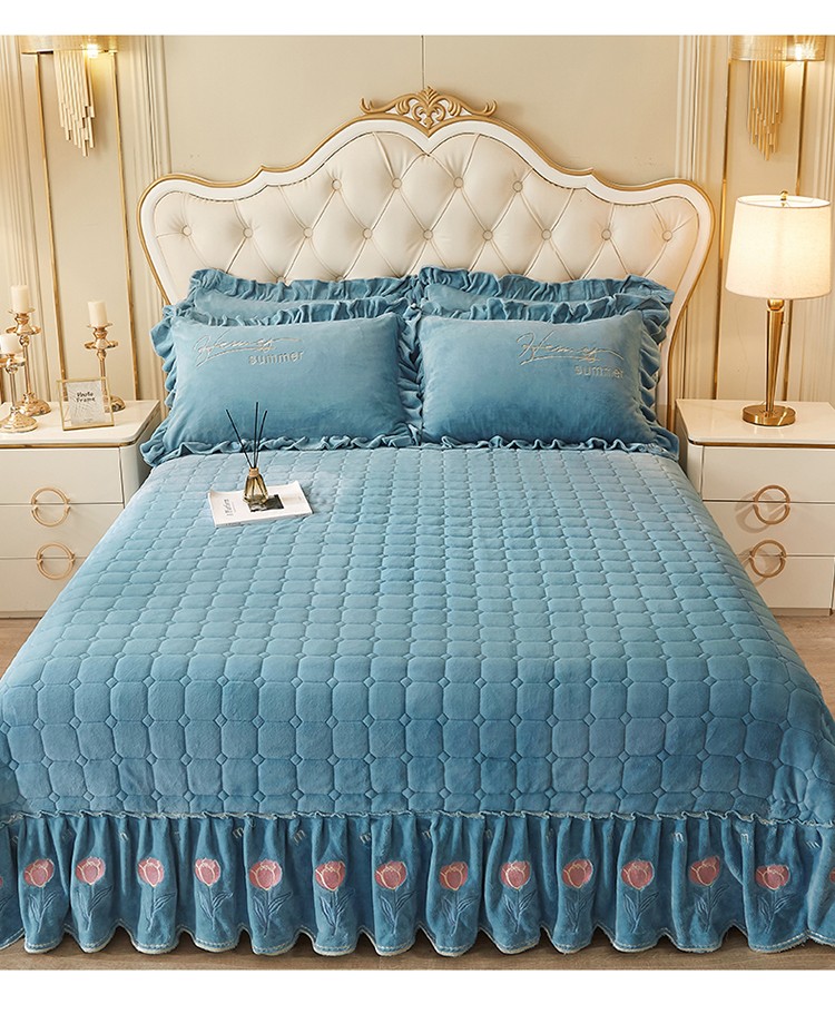 恒爱 2022秋冬新款A类牛奶绒羽毛刺绣夹棉床盖款三件套 水光兰