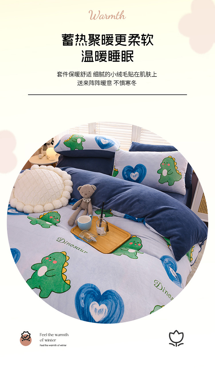 芃成 2022新款加厚双面牛奶绒印花床品系列-四件套 爱心恐龙
