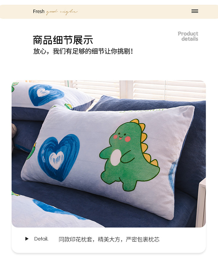 商品名称:芃成 2022新款加厚双面牛奶绒印花床品系列-四件套 爱心恐龙