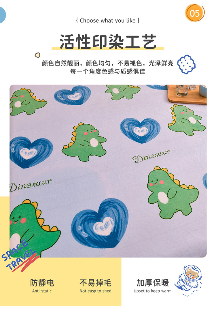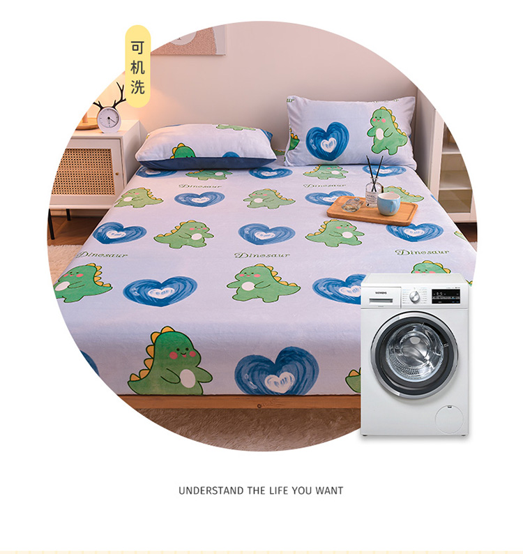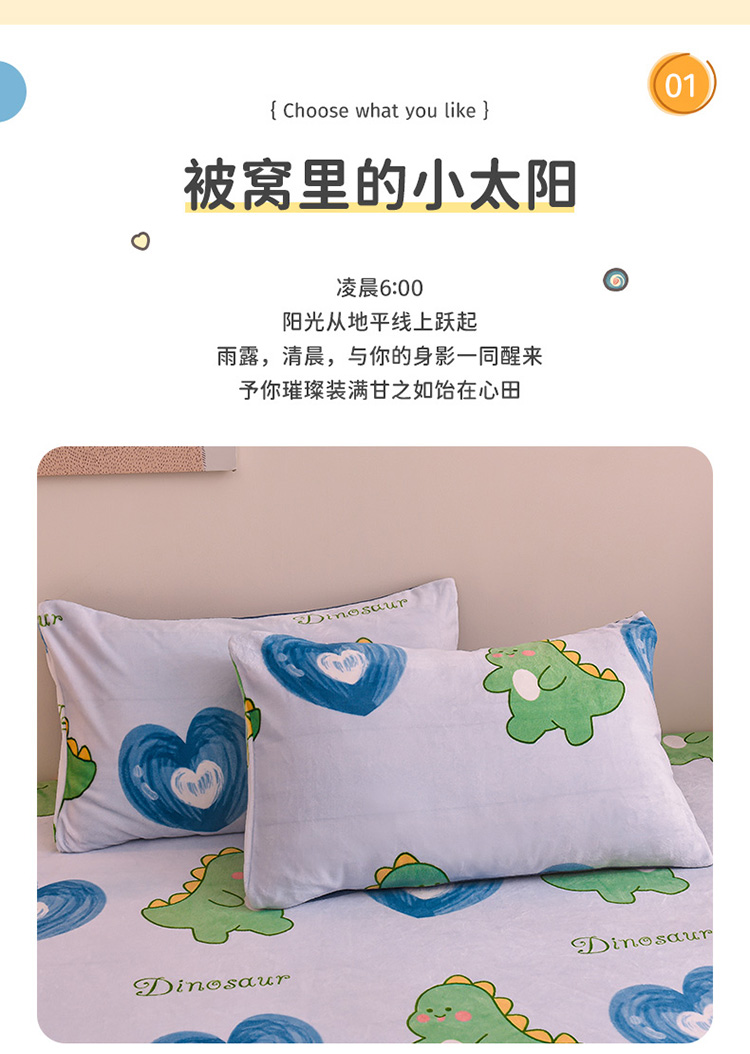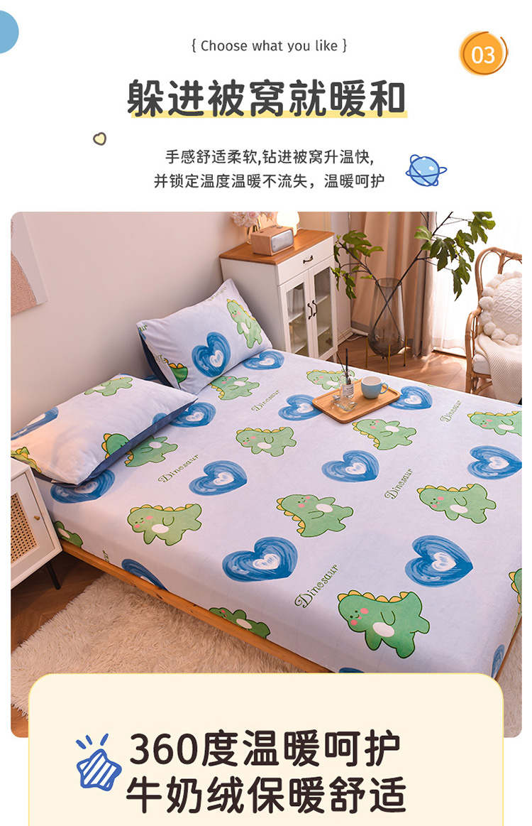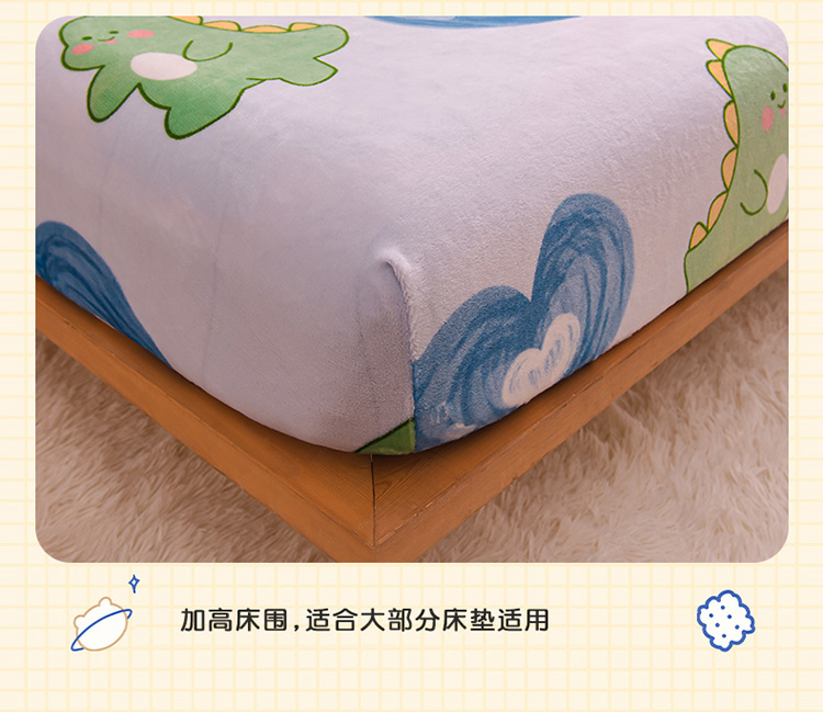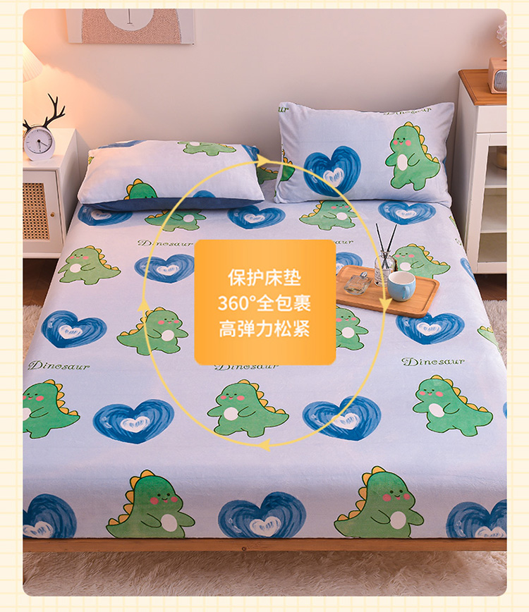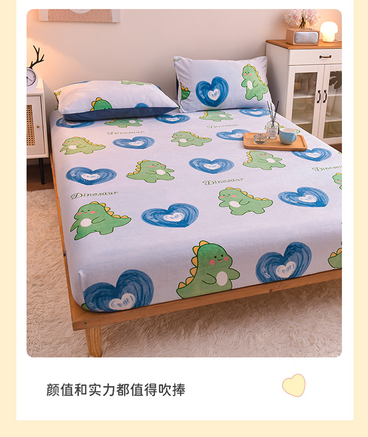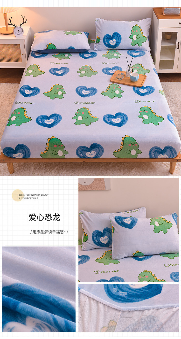 • 91家纺网 家纺一手货源 找家纺 芃成 2022新款加厚双面牛奶绒印花床品系列-单床笠 爱心恐龙