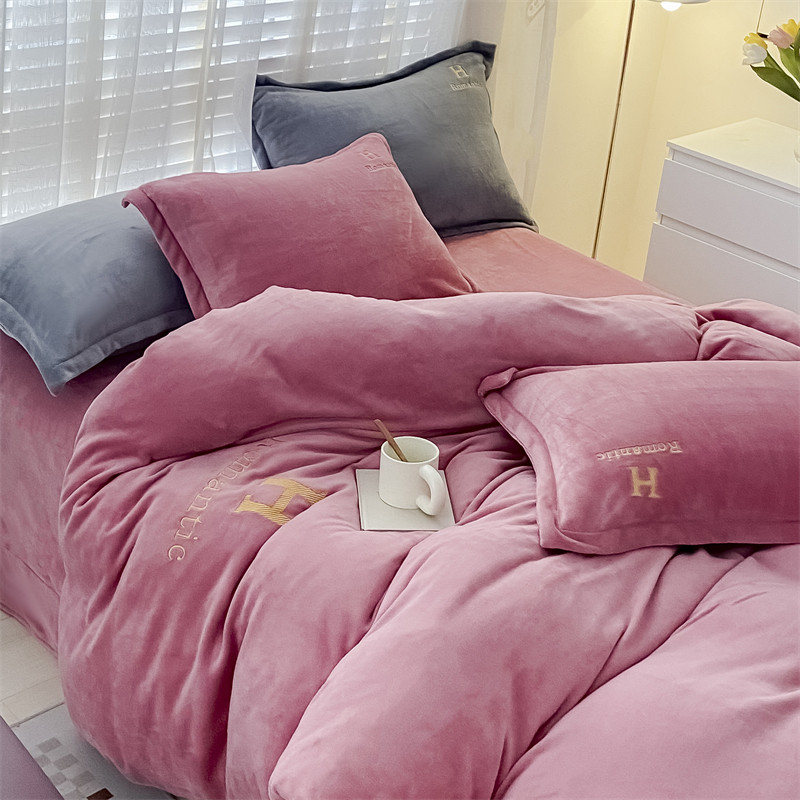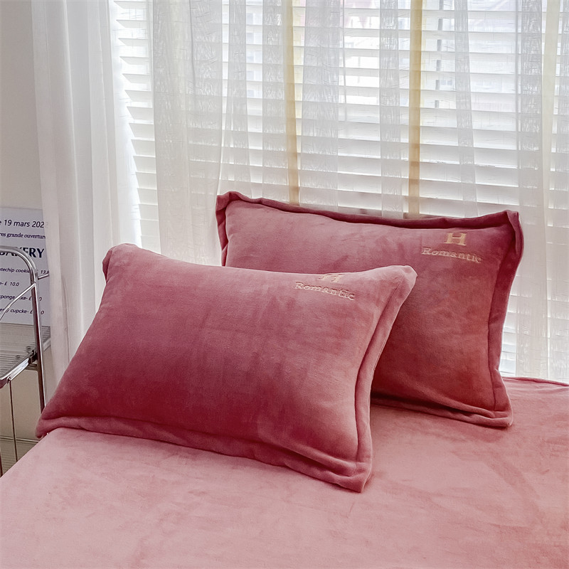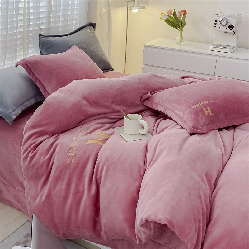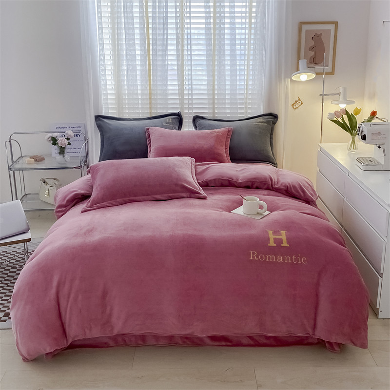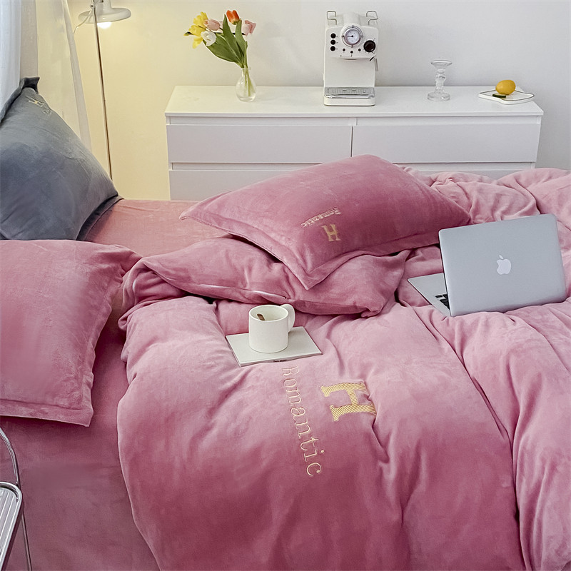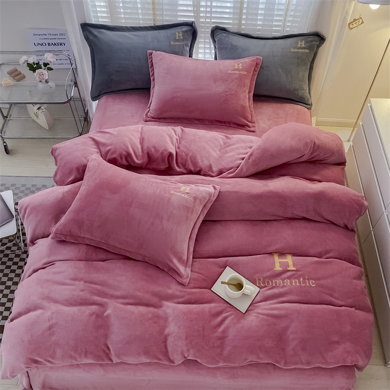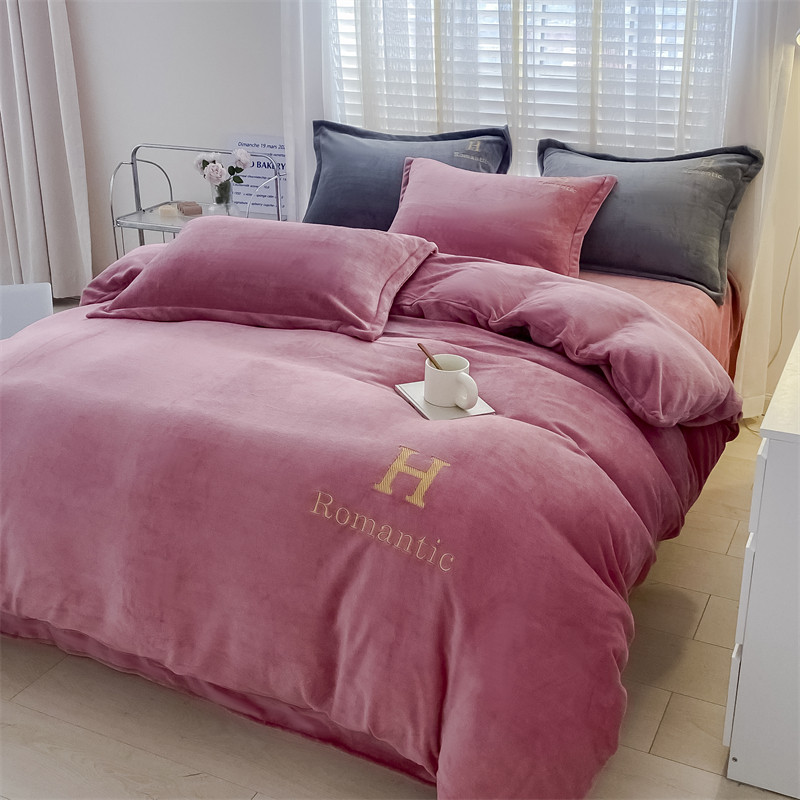 爱洛 2022新款200克7.5斤纯色刺绣花牛奶绒四件套 牛奶绒-豆沙色