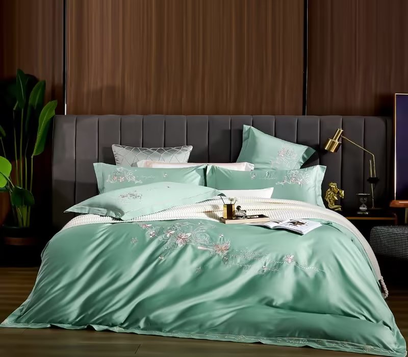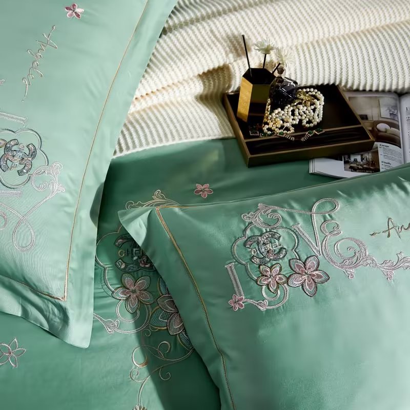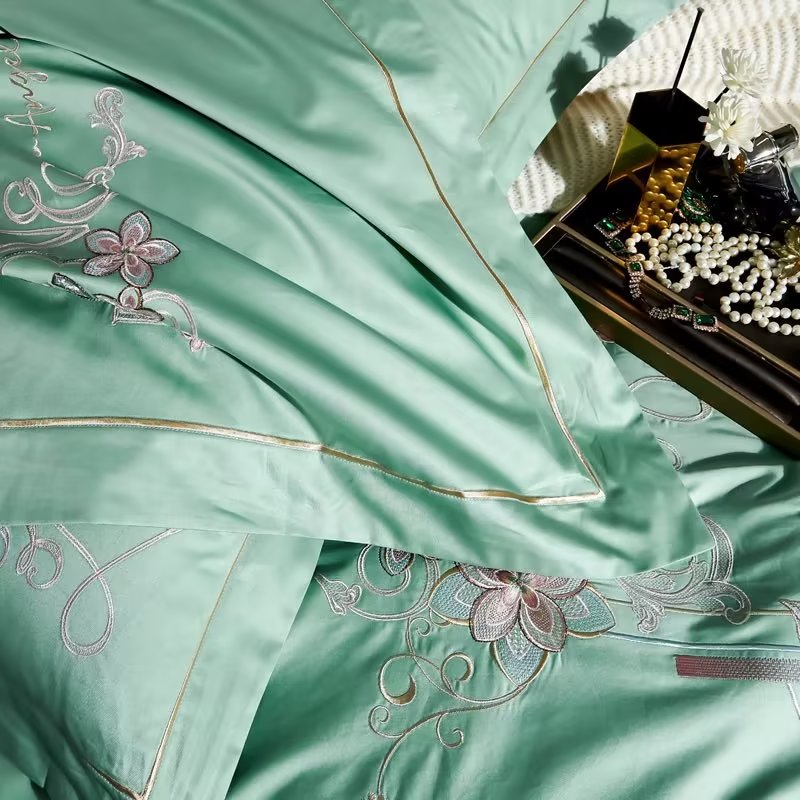 U品汇 2023新品120支60S长绒棉宽边刺绣花贡缎纯棉全棉四件套 暗香-浅石兰