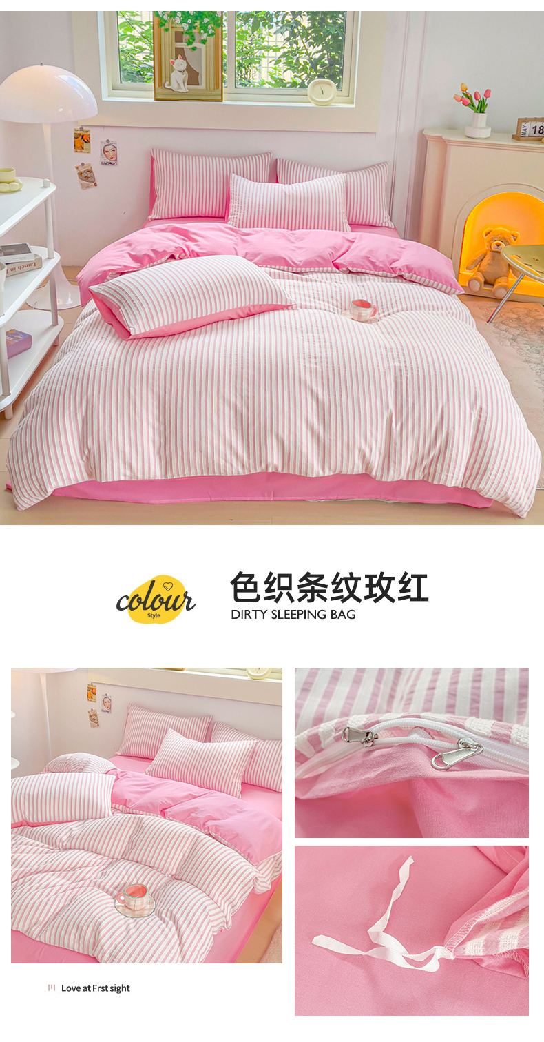 商品名称:千朵 2023新款全棉色织条纹四件套 色织条纹玫红