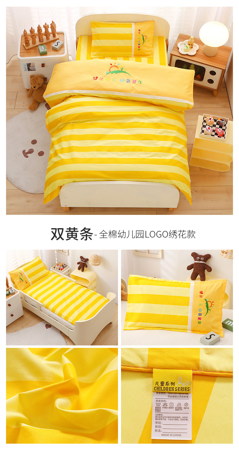 当前位置: 91家纺网 > 商品网购 > 床品套件 > 多件套 > 多件套 > 订做纯色绣花logo纯棉刺绣园标幼儿园被子三件套午睡六件套 双黄条