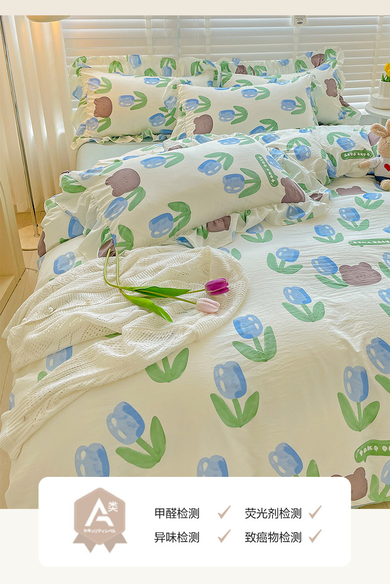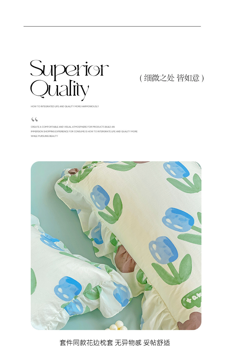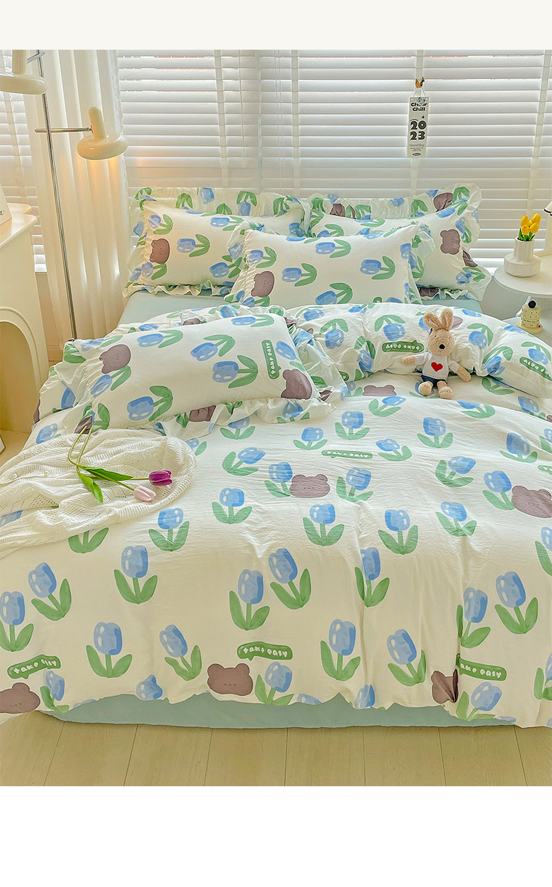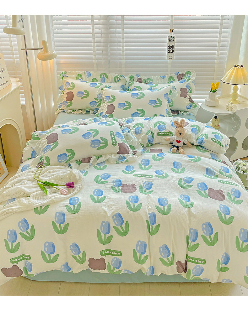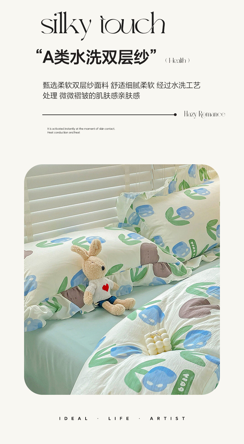 当前位置: 91家纺网 > 商品网购 > 床品套件 > 四件套 > 水洗棉四件套 > 贝扬思家纺 2023新款韩风水洗双层纱荷叶边四件套-场景二 蓝海玫瑰