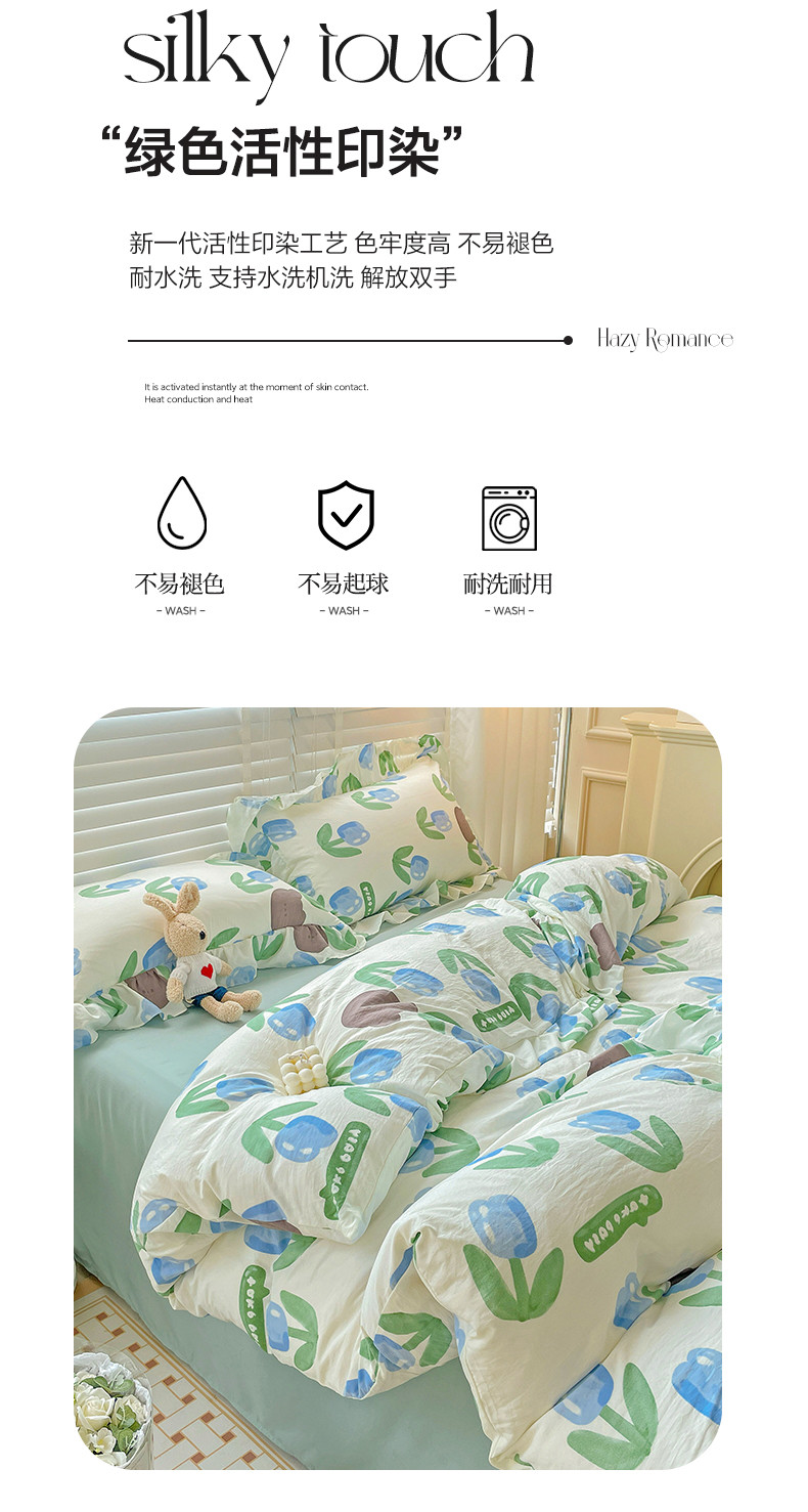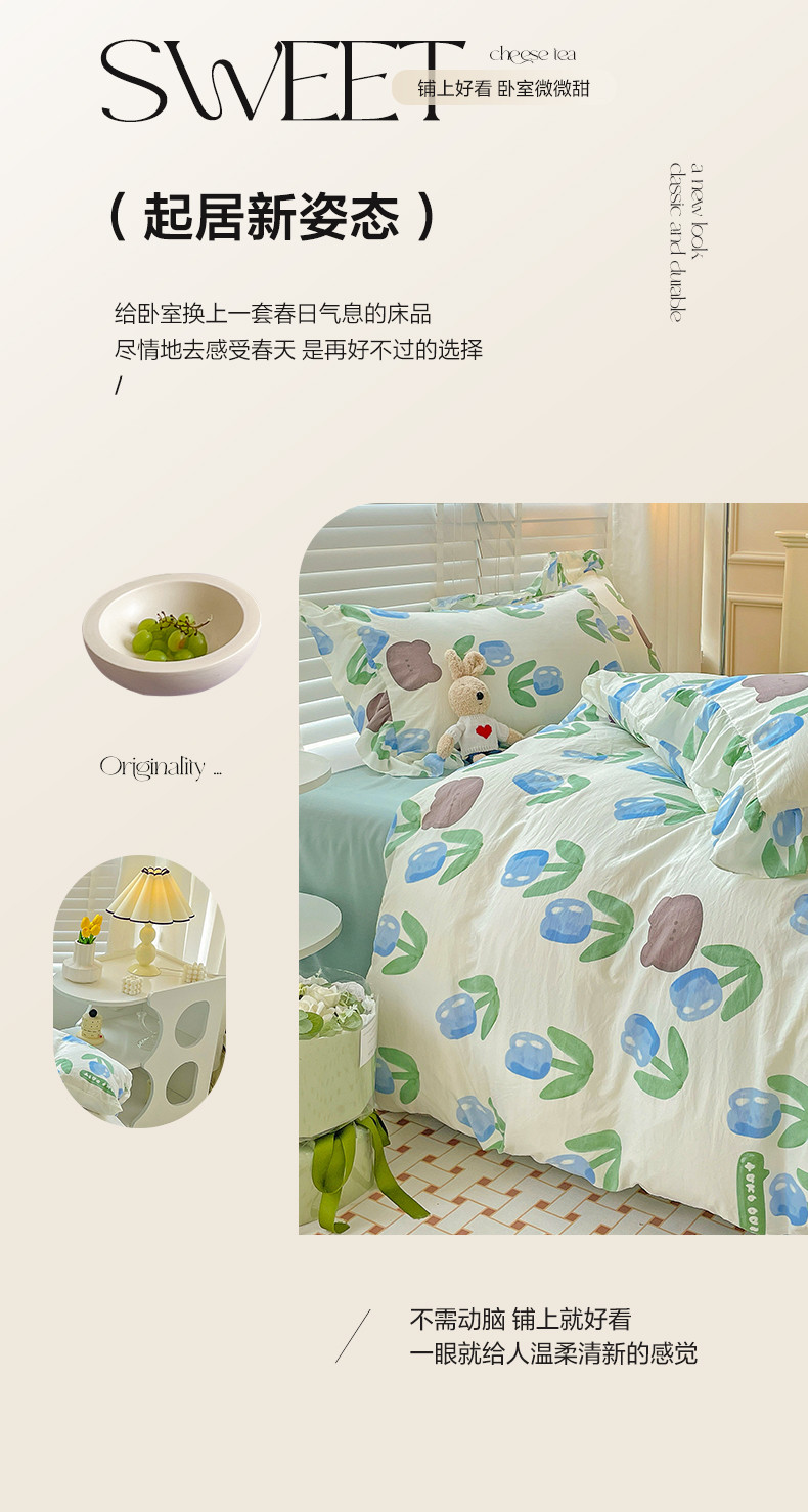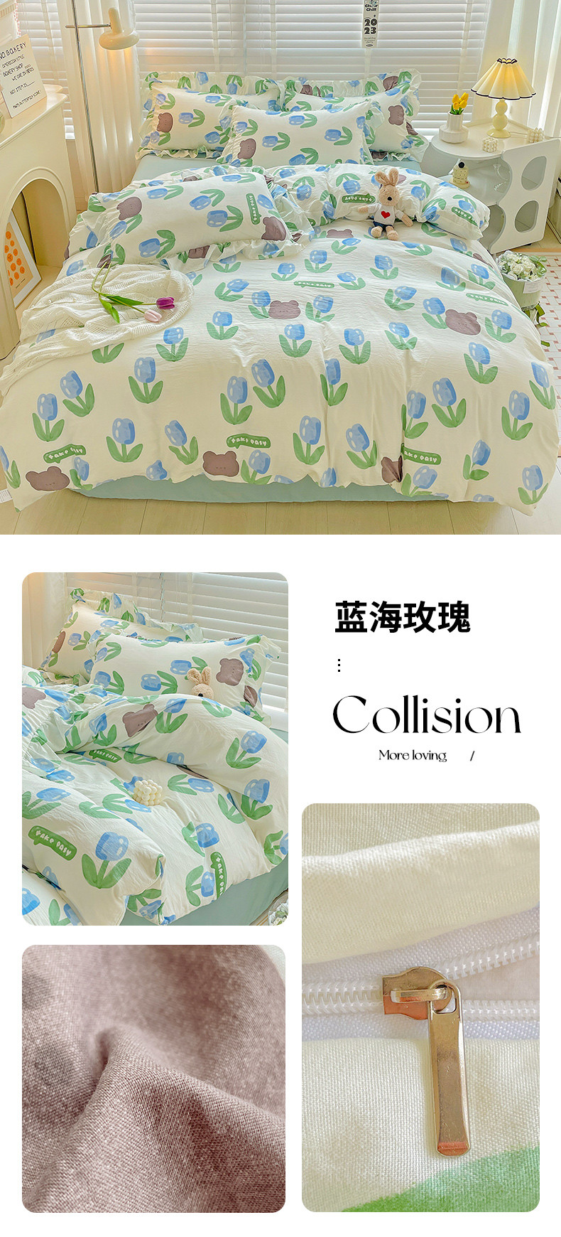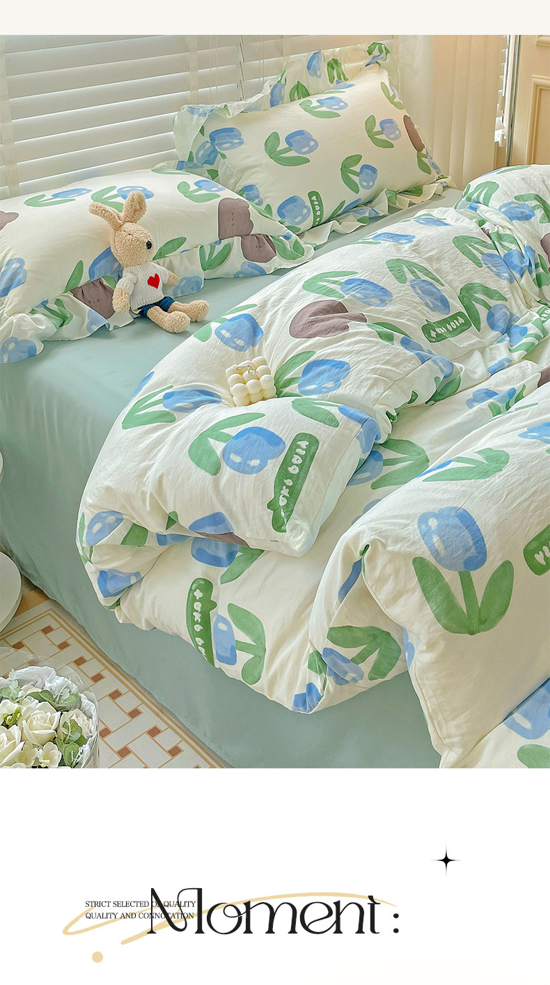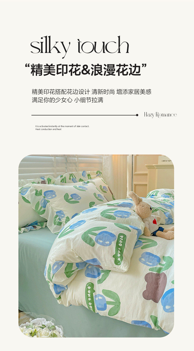 当前位置: 91家纺网 > 商品网购 > 床品套件 > 四件套 > 水洗棉四件套 > 贝扬思家纺 2023新款韩风水洗双层纱荷叶边四件套-场景二 蓝海玫瑰