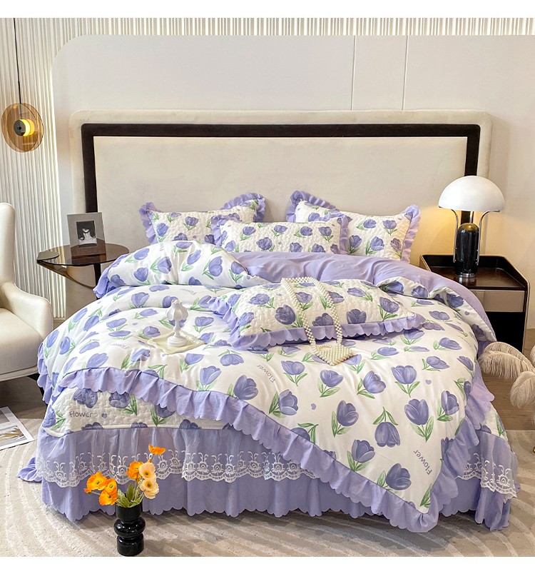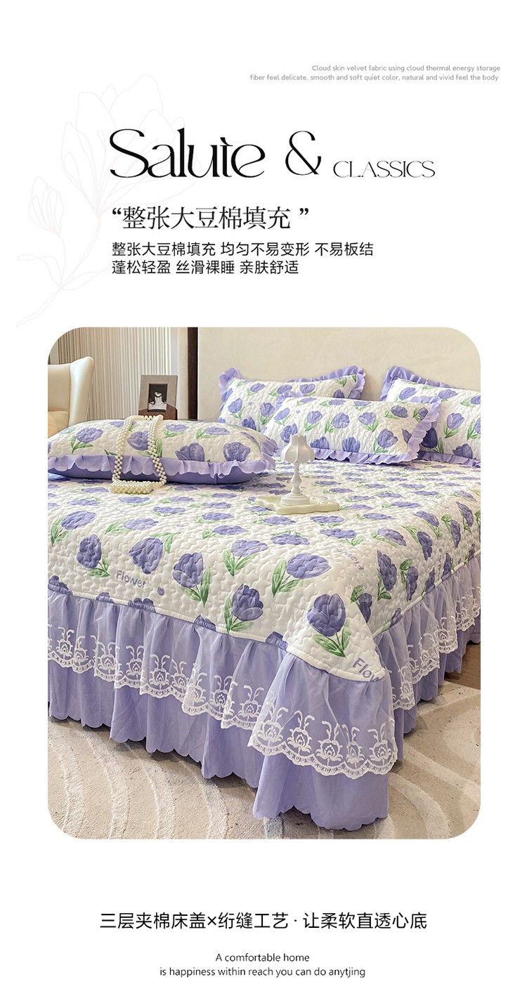 秋冬款A类母婴级双层纱棉麻夹棉床盖蕾丝花边床裙款全棉纯棉夹棉床盖三件套