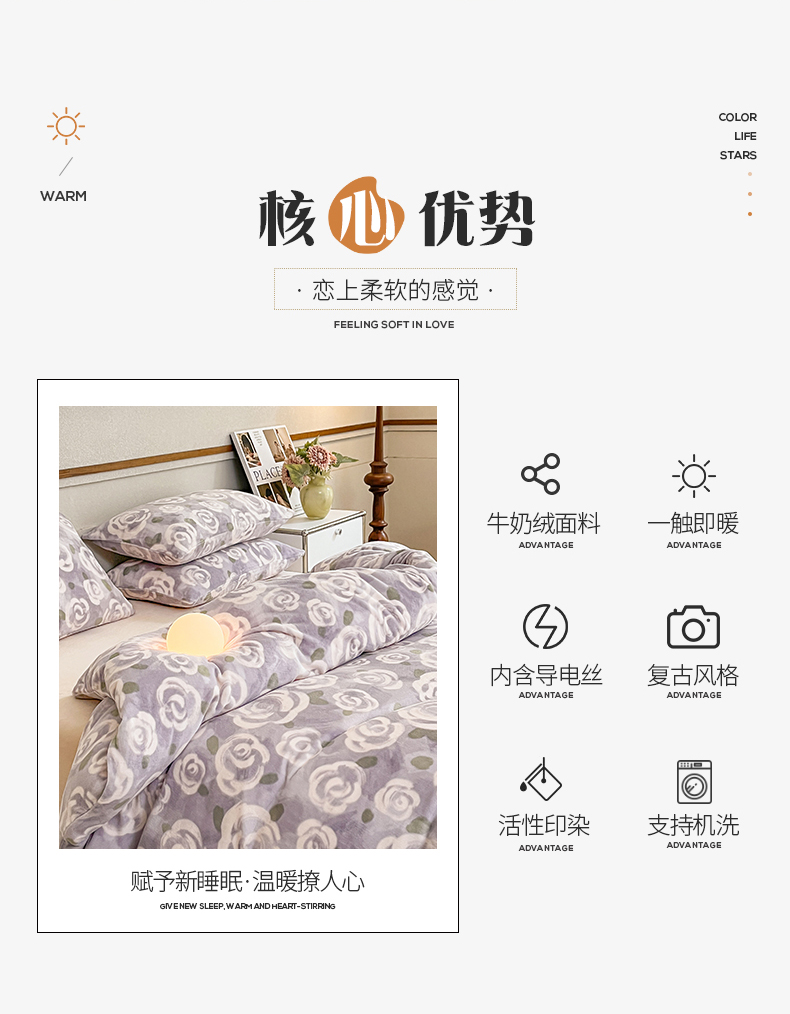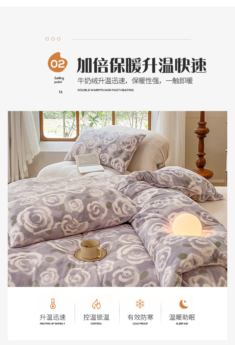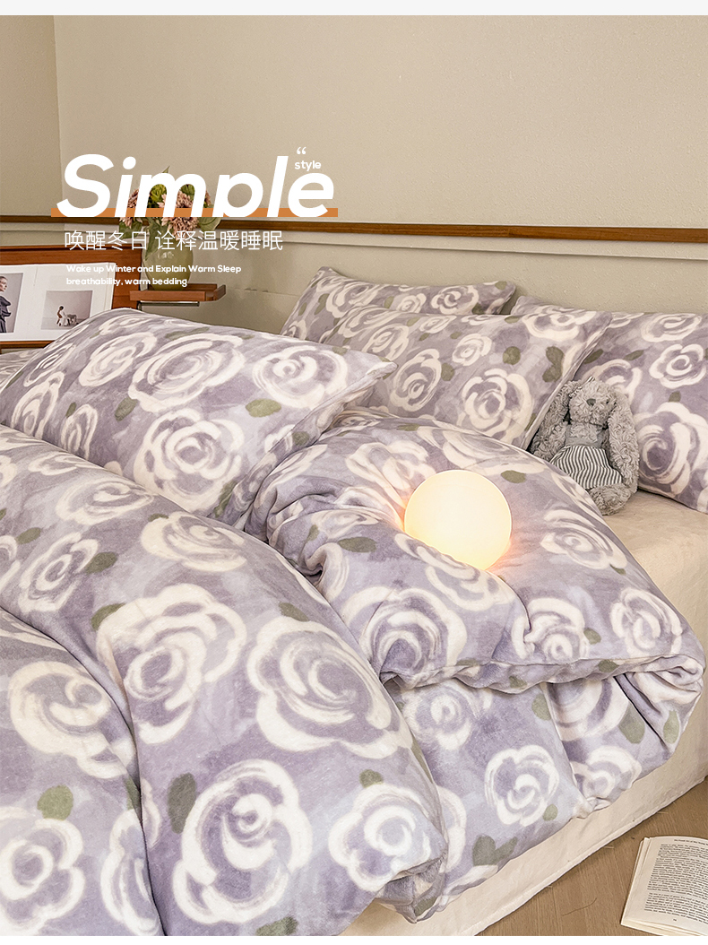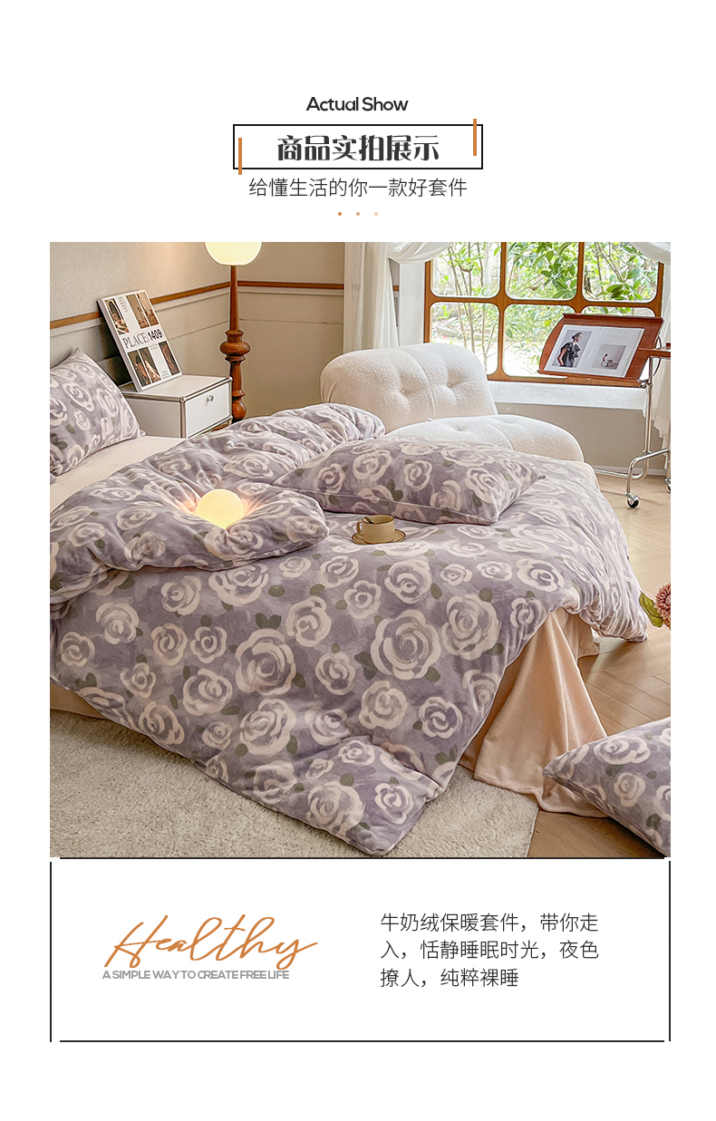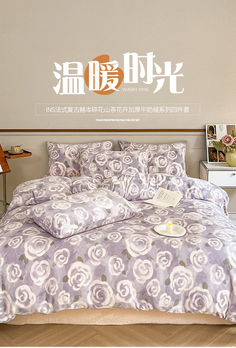 桃子家居 2023新款ins法式复古赫本碎花山茶花卉加厚牛奶绒系列四件套 绒-紫色茉香
