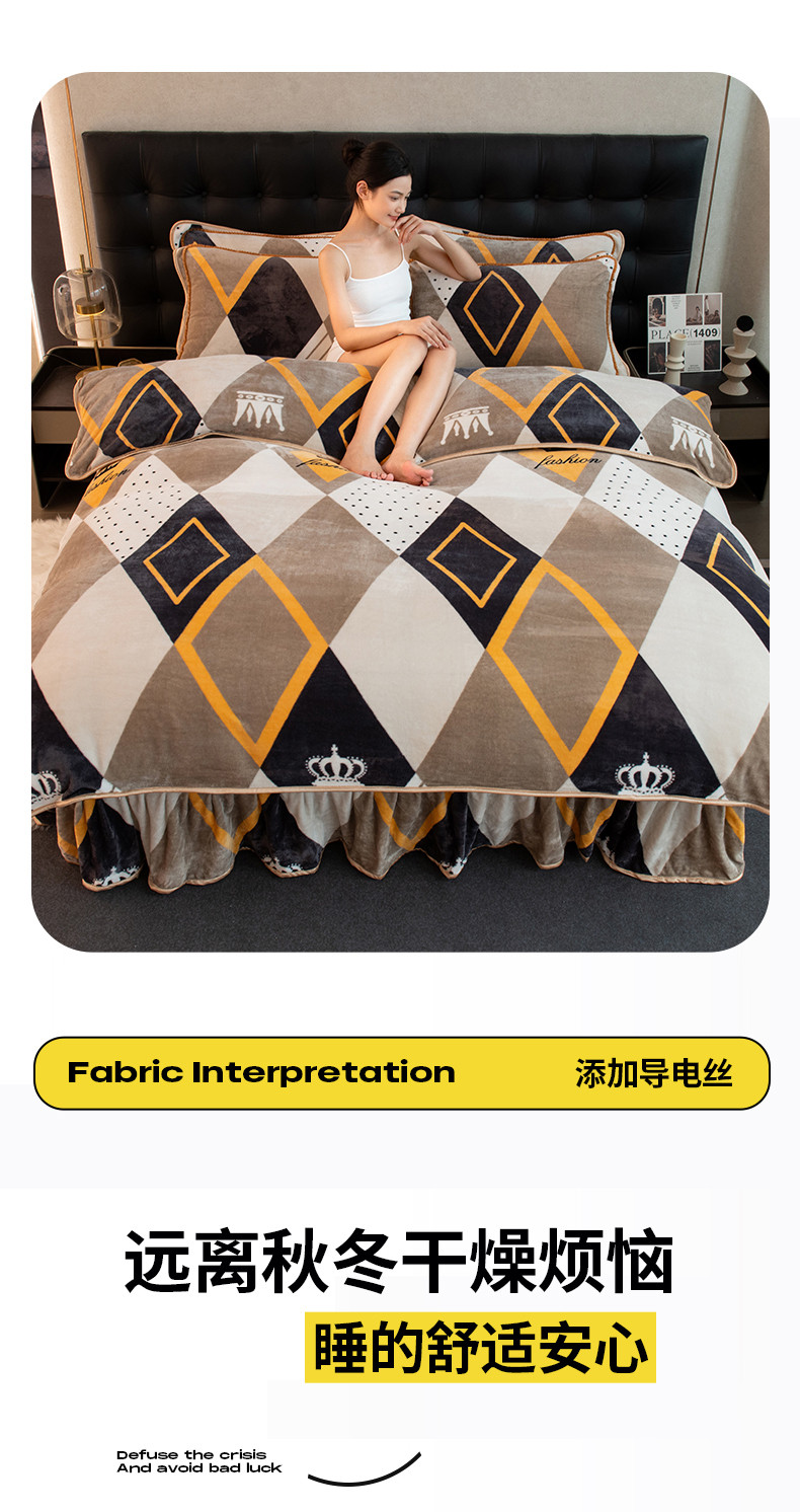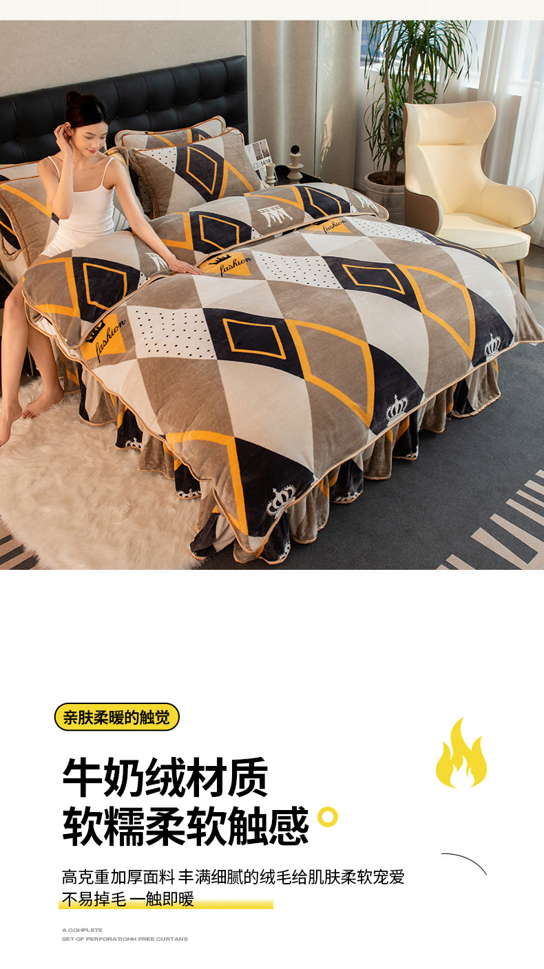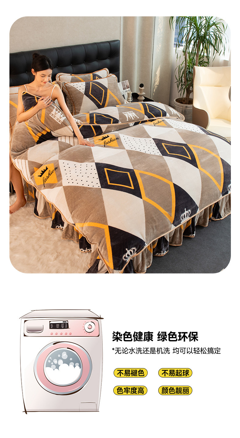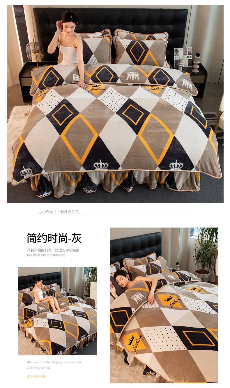 商品名称:2024印花8.5斤牛奶绒金貂水晶法莱珊瑚绒四件套床裙款 简约时尚-灰