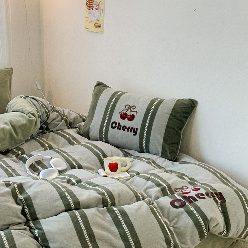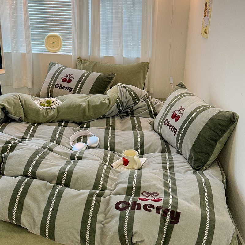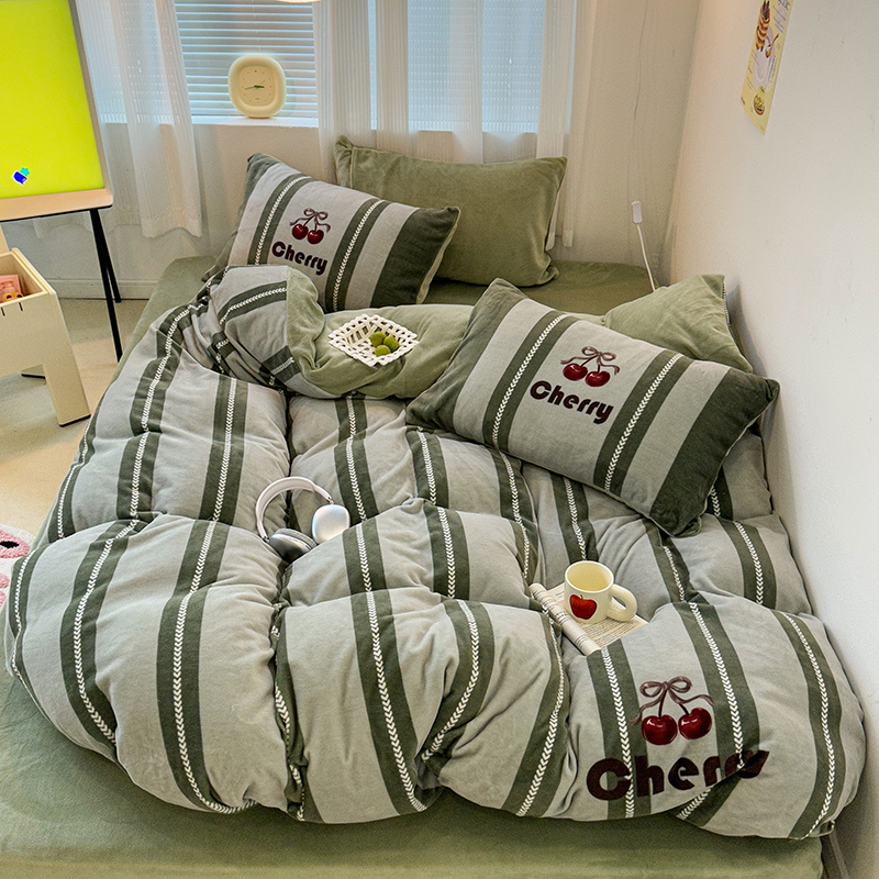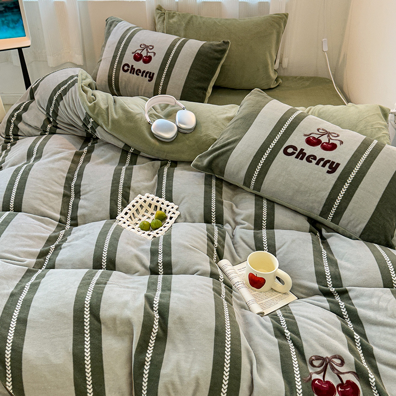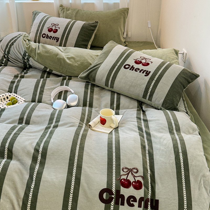 昔可家纺 2023新款大版数码印花保暖牛奶绒四件套 复古丝带樱桃