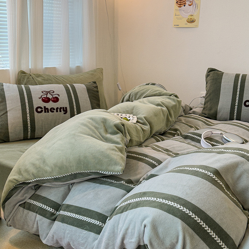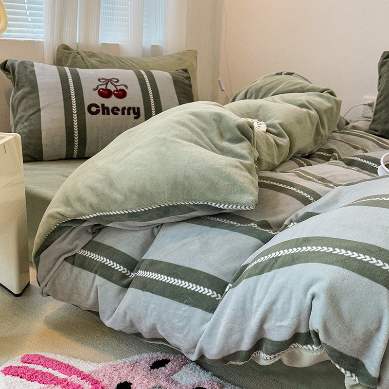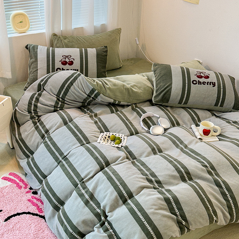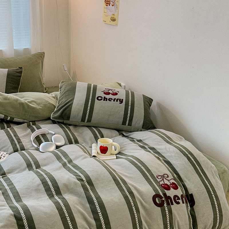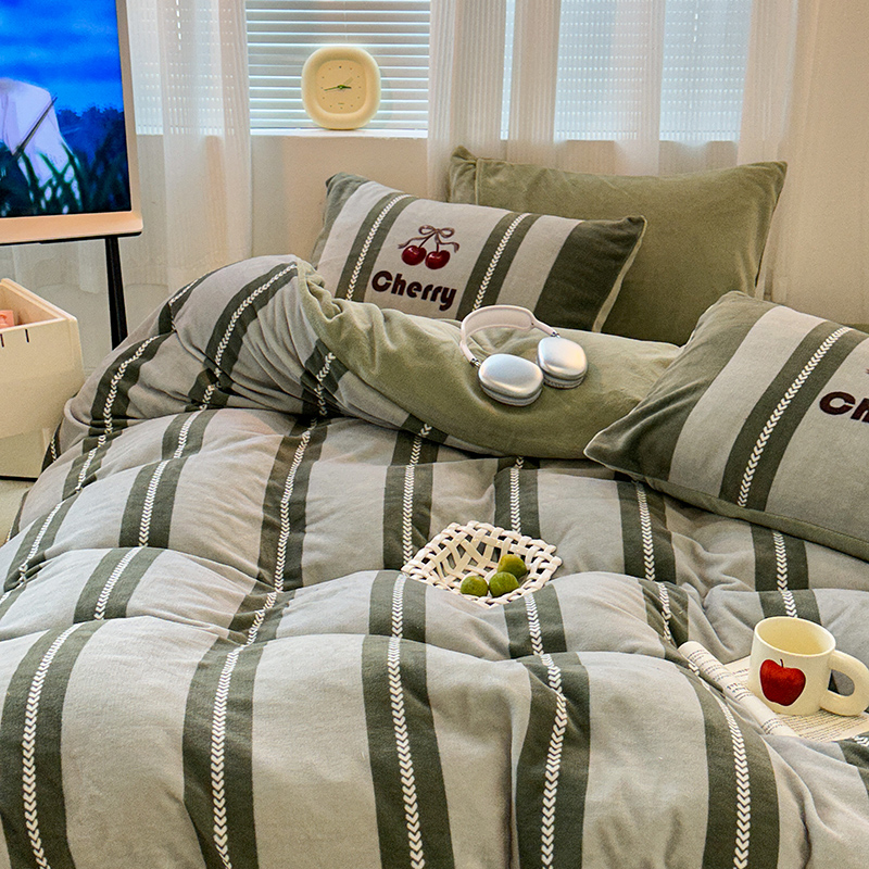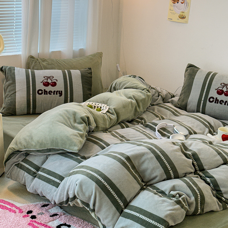 昔可家纺 2023新款大版数码印花保暖牛奶绒四件套 复古丝带樱桃