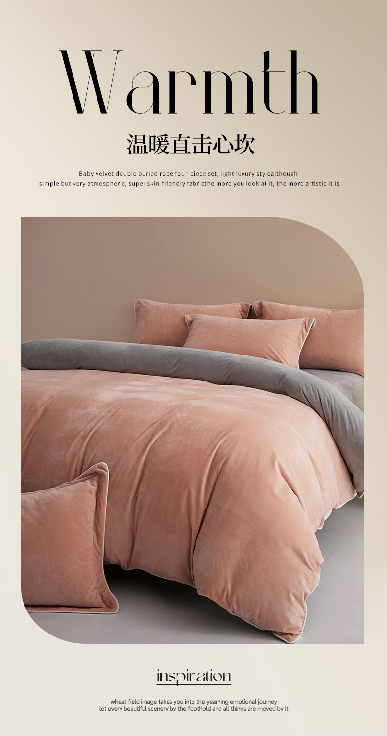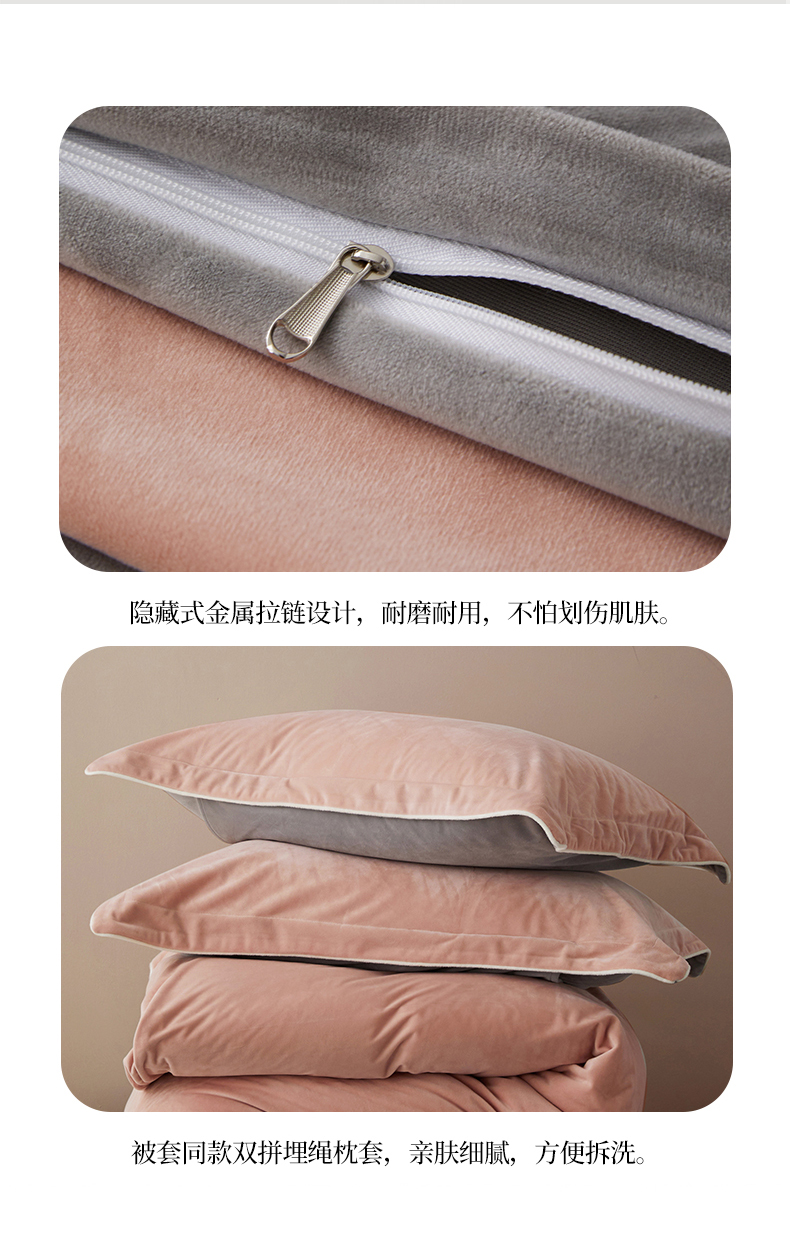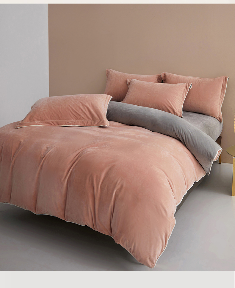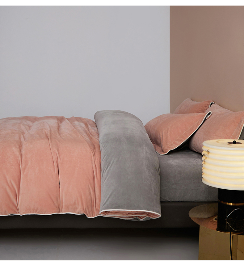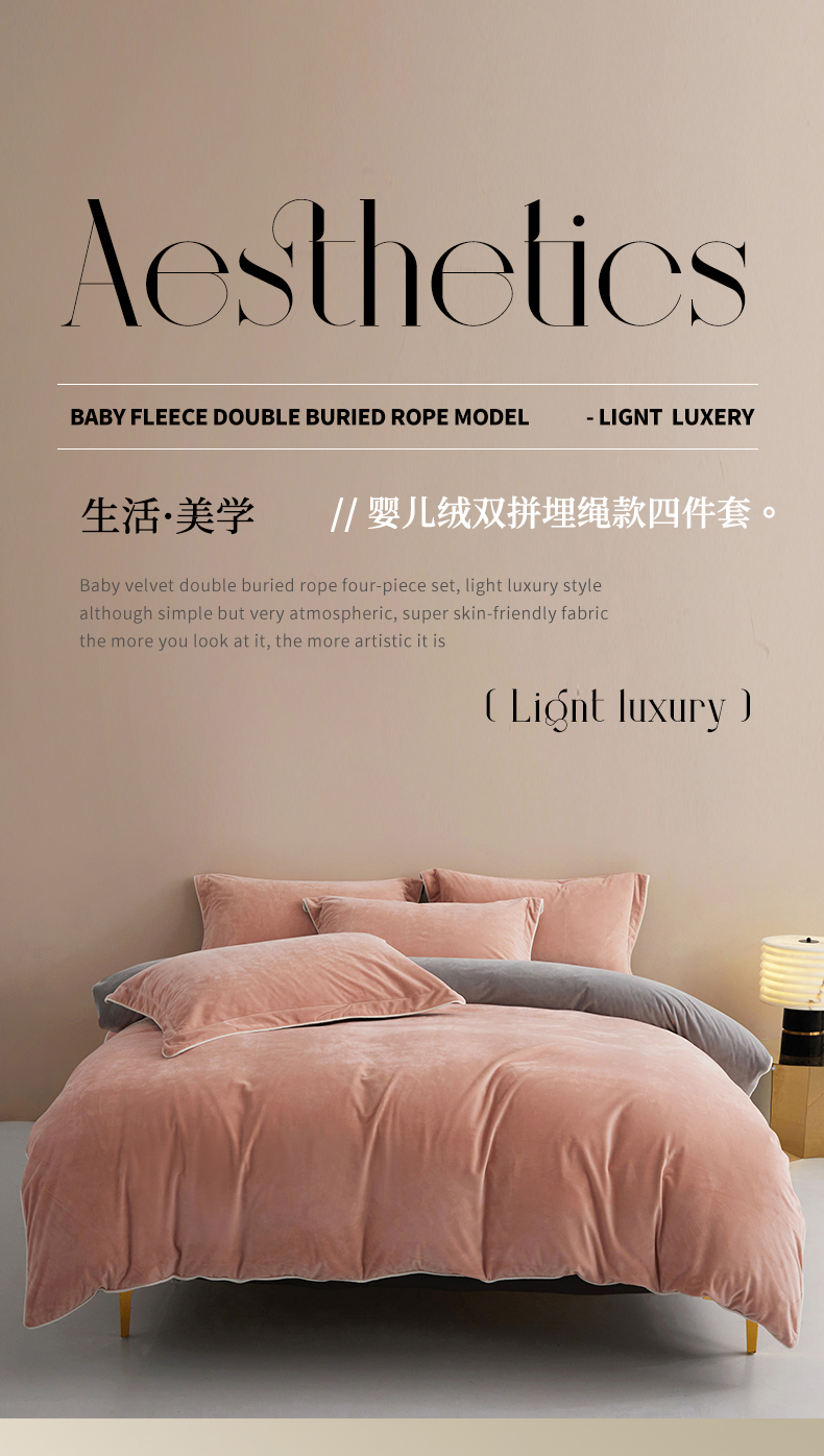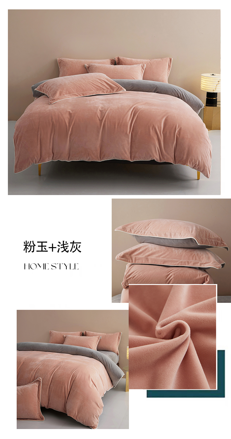 商品名称:丝涟2023新款轻奢风高克重230g婴儿绒德肤绒亲肤舒适双拼色埋线款滚绳四件套 粉玉+浅灰