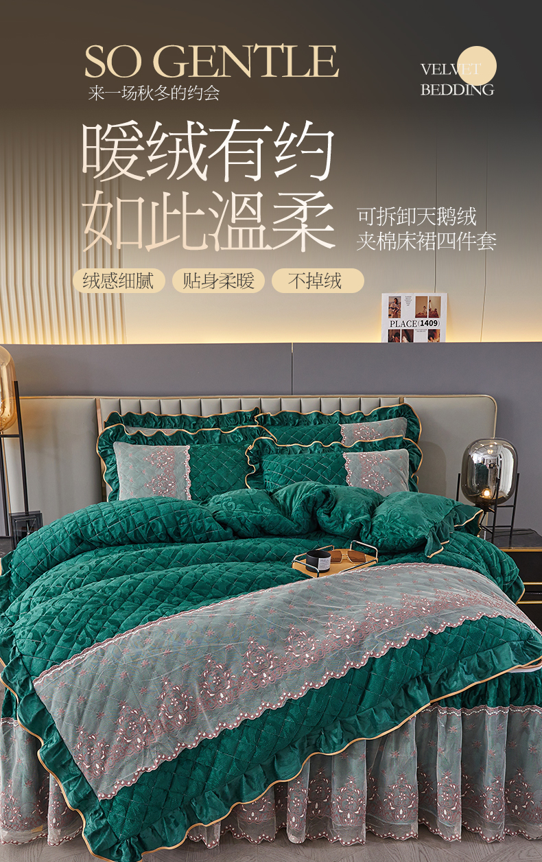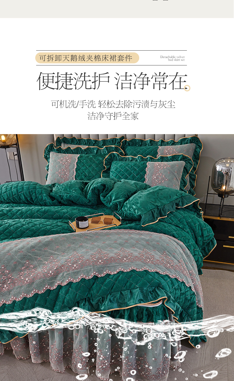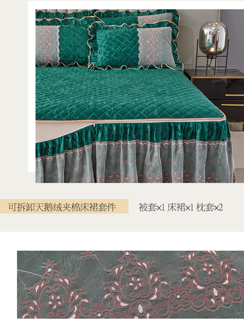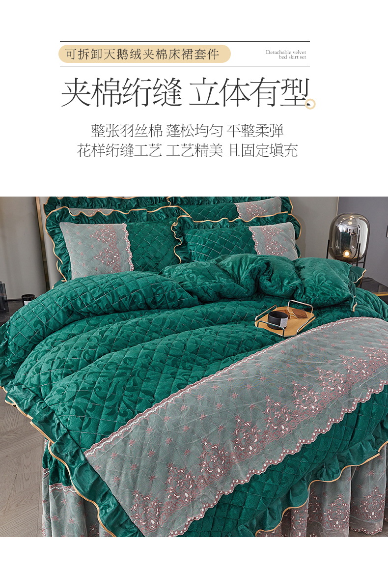 网红馆 2025新款可拆卸天鹅绒夹棉床裙四件套-城市魅影 城市魅影 翠绿