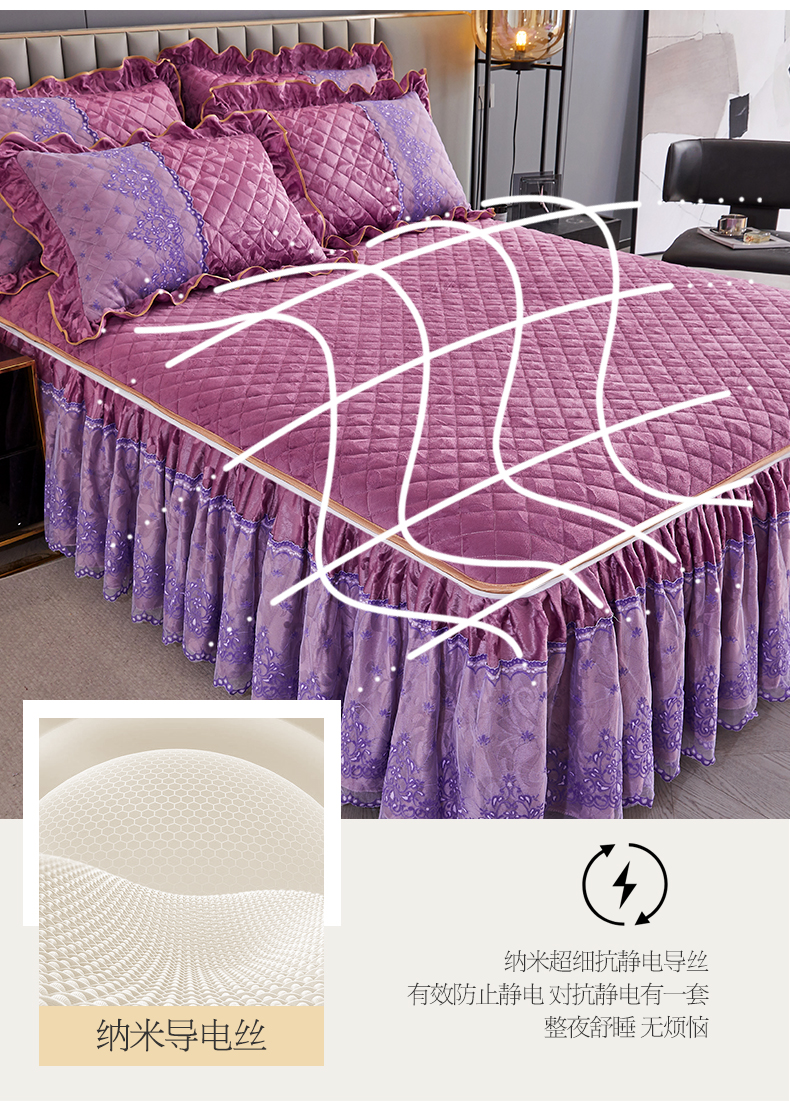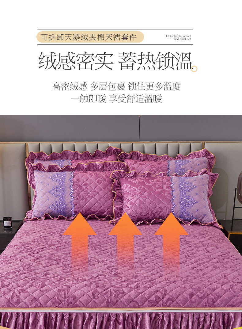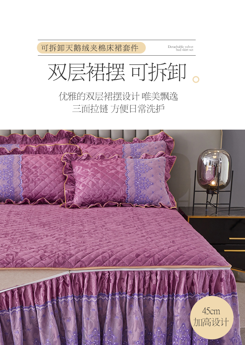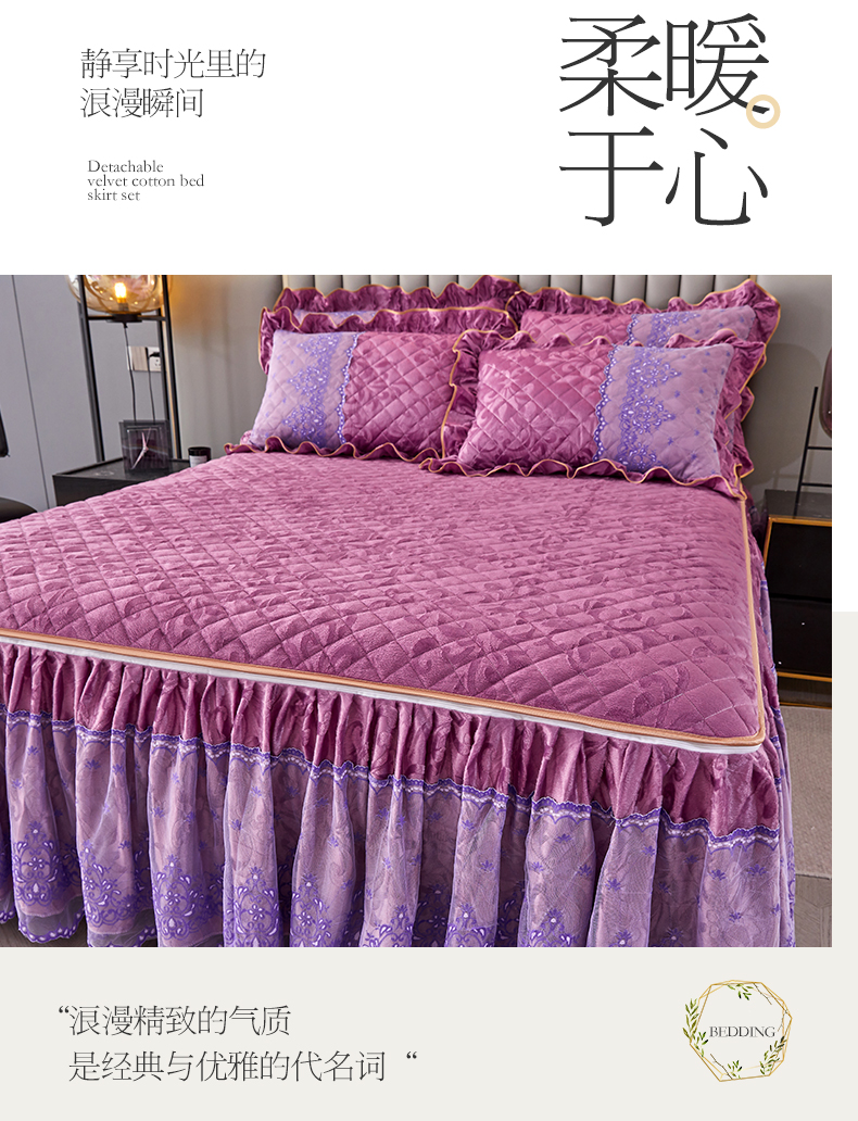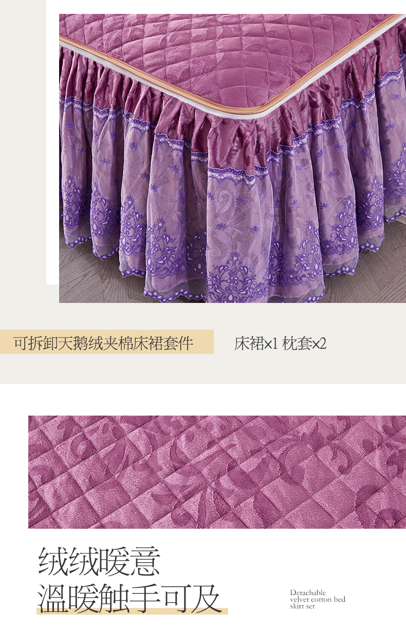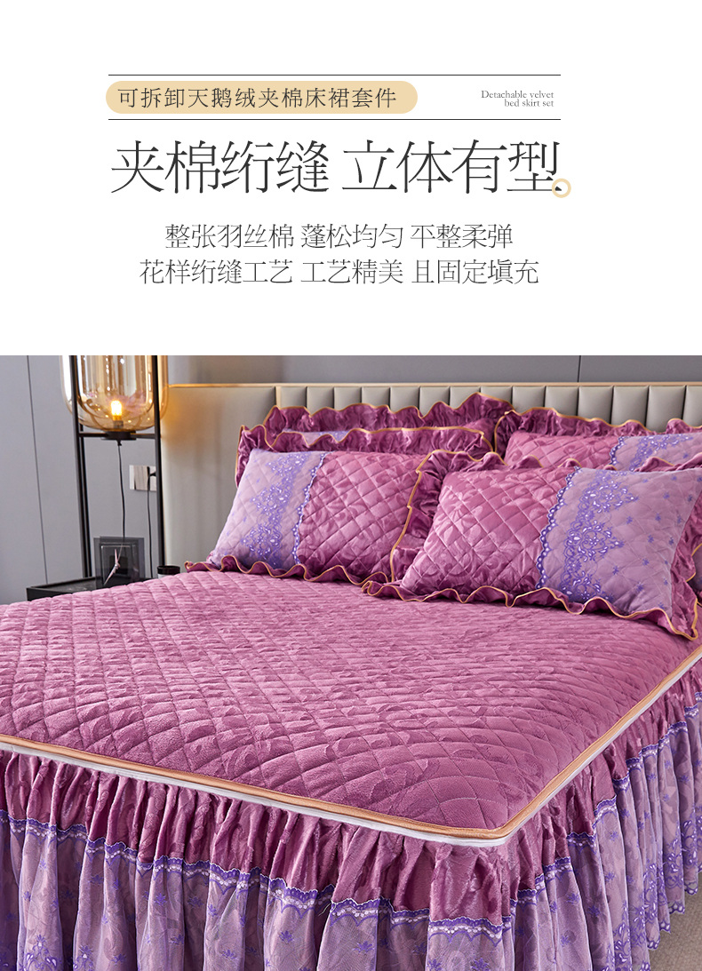 商品名称:网红馆 2025新款可拆卸天鹅绒夹棉床裙三件套-城市魅影 城市魅影 优雅紫
