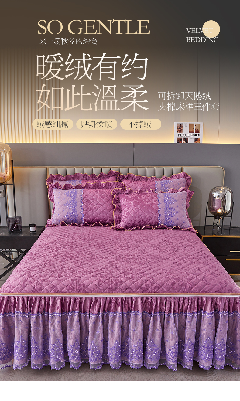网红馆 2025新款可拆卸天鹅绒夹棉床裙三件套-城市魅影 城市魅影 优雅紫