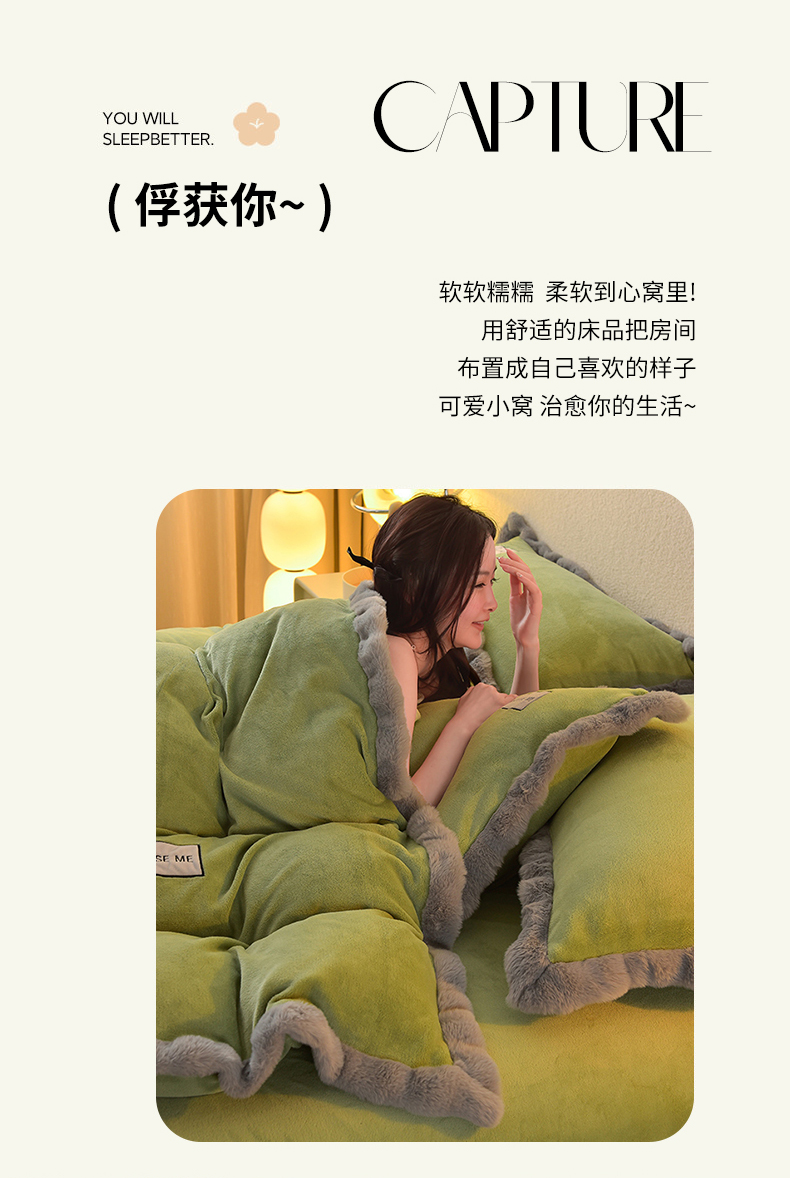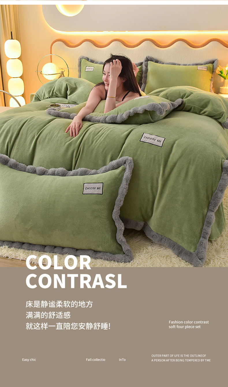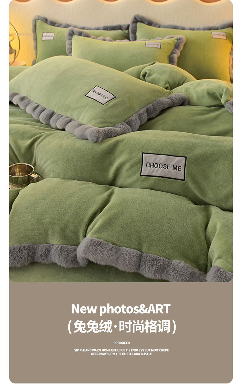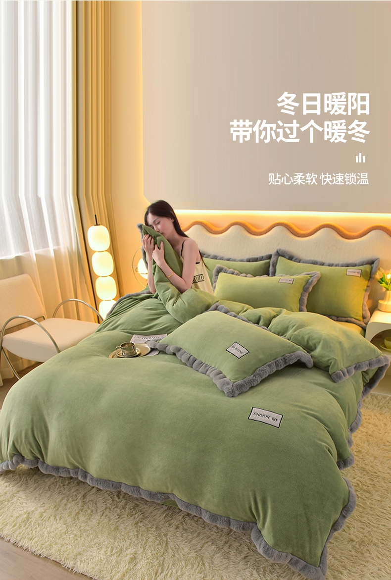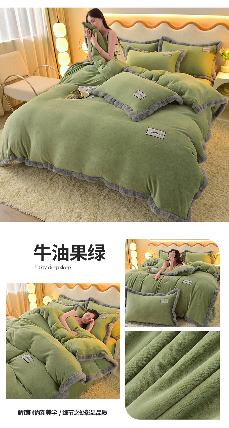 商品名称:米奈家居 2025新款A类高克重牛奶绒四件套-卡洛琳 叶绿