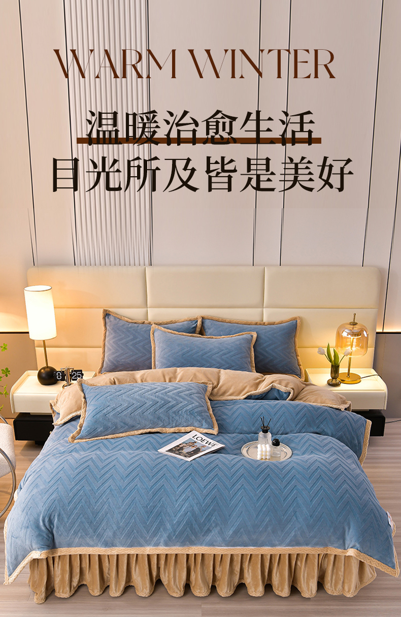 星窝家纺 2023直播电商爆款高克重9斤加厚雕花绒牛奶绒四件套 格调蓝色