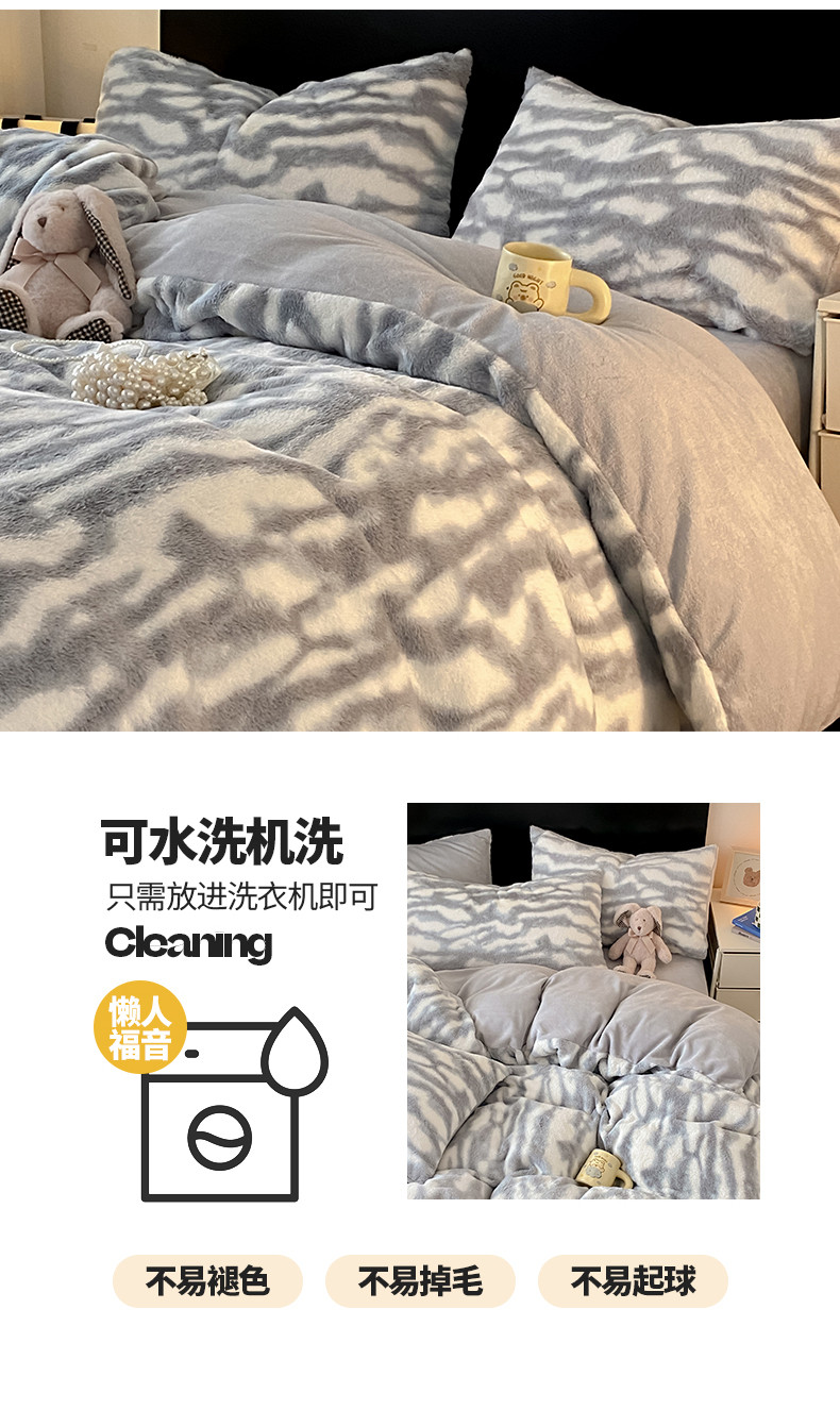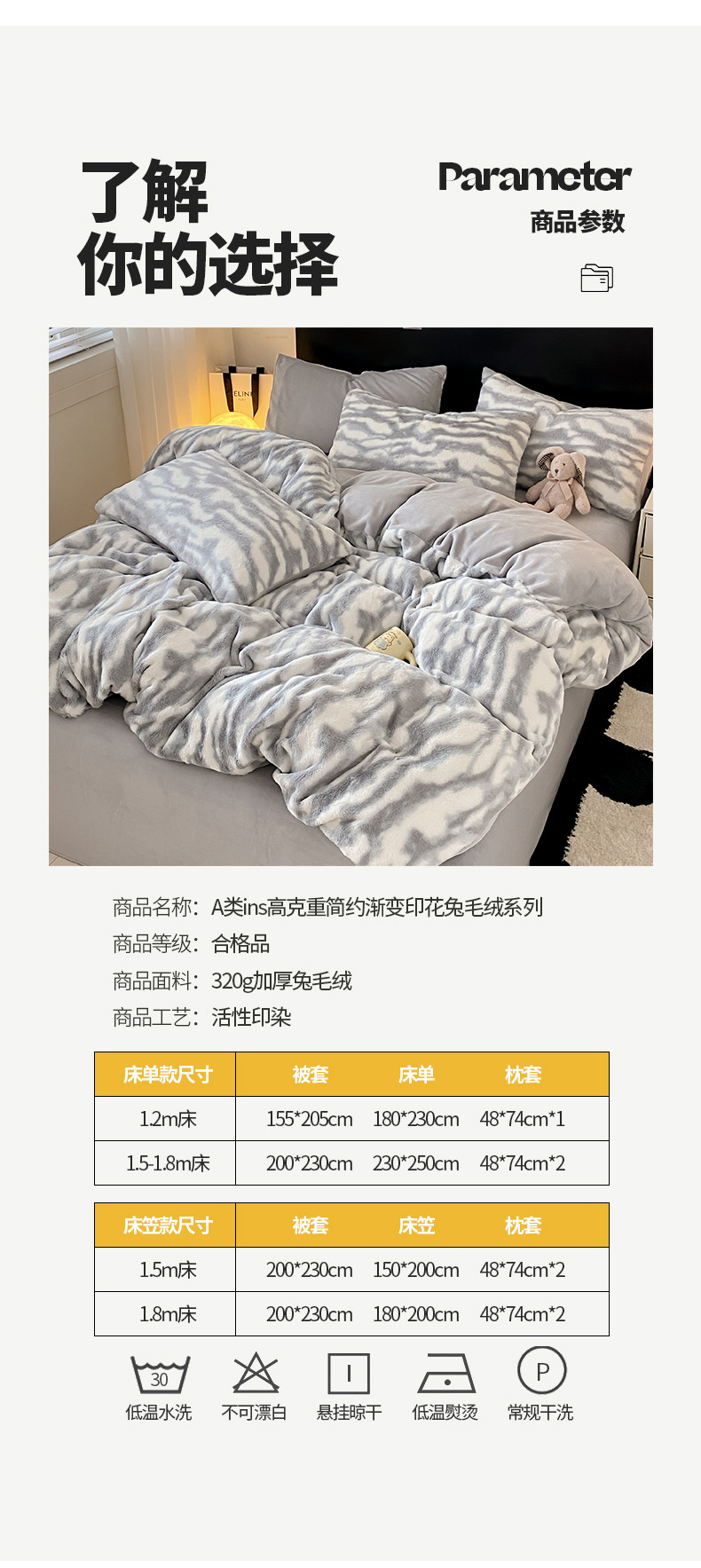 商品名称:A类ins高克重320克简约渐变印花兔毛绒暖绒加厚牛奶绒系列四件套 绒兔毛-灰洛卡