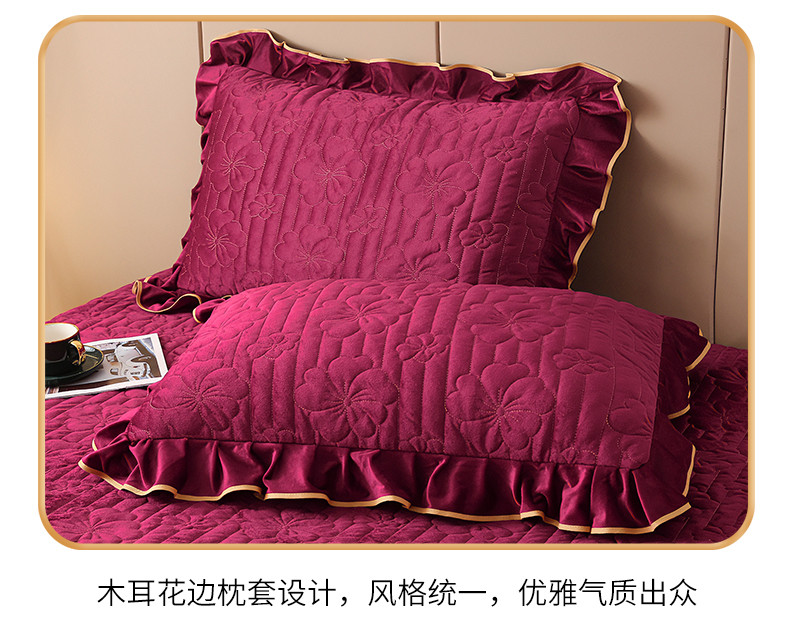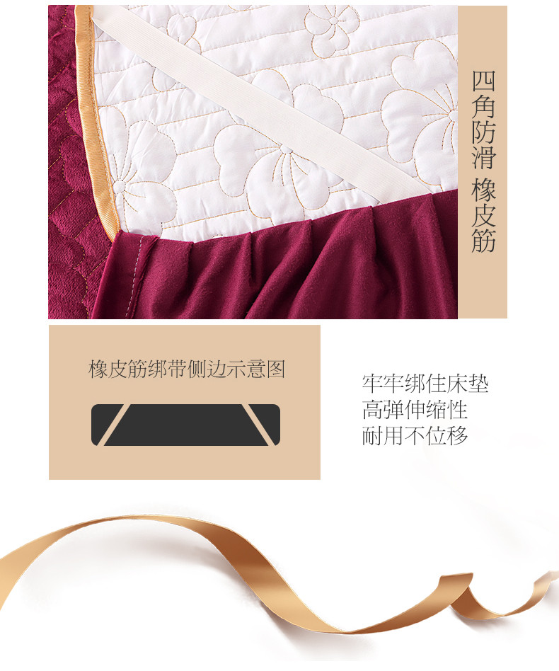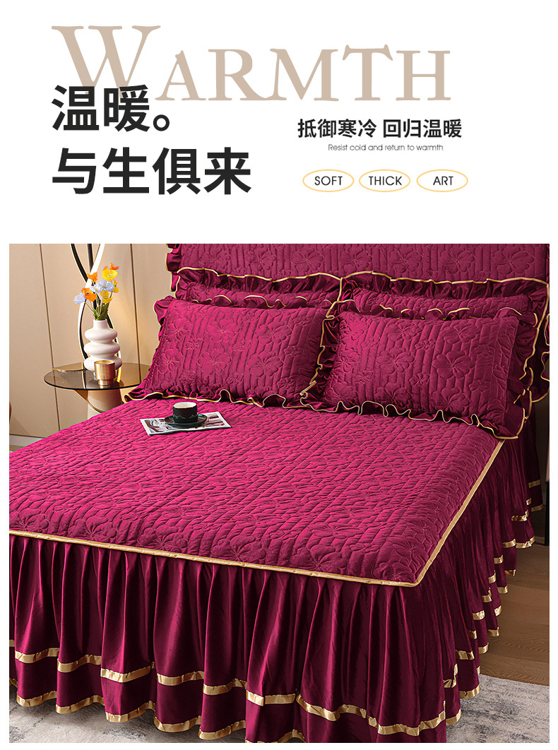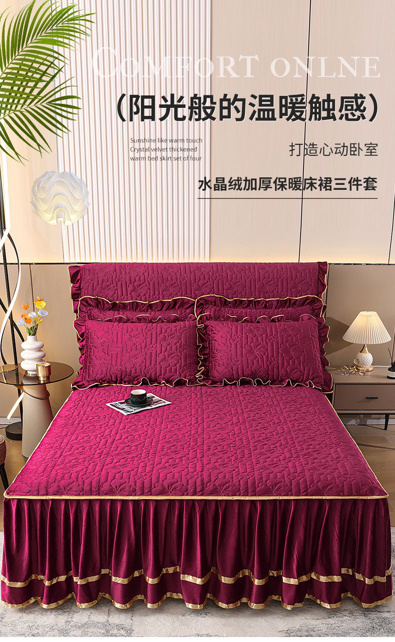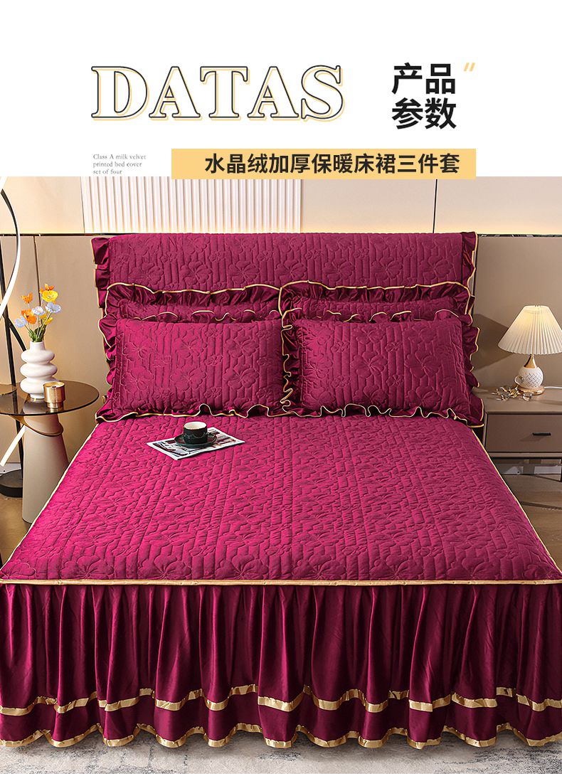 (总)屹成家纺2025新款水晶绒夹棉绗缝蕾丝床裙三件套(塞纳河畔)床裙单件起售价不低于105元,大红,豆沙,翡翠绿,粉玉,橄榄绿,蔚蓝,银灰