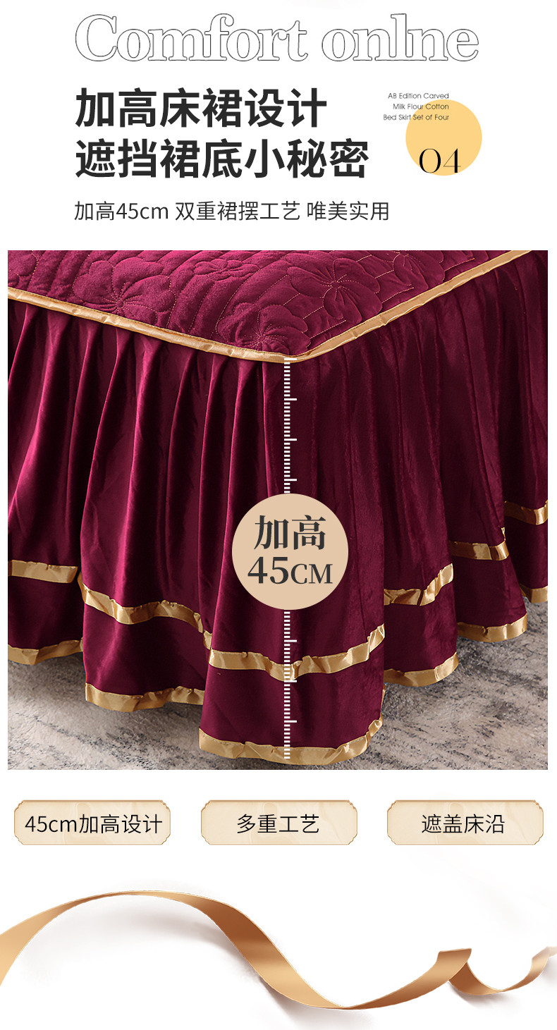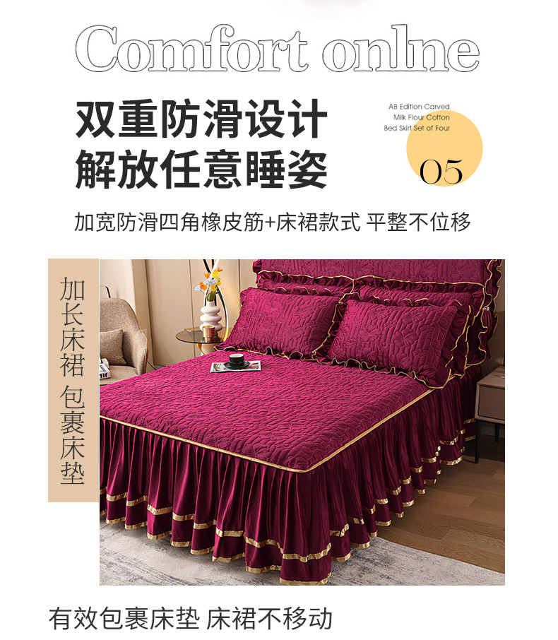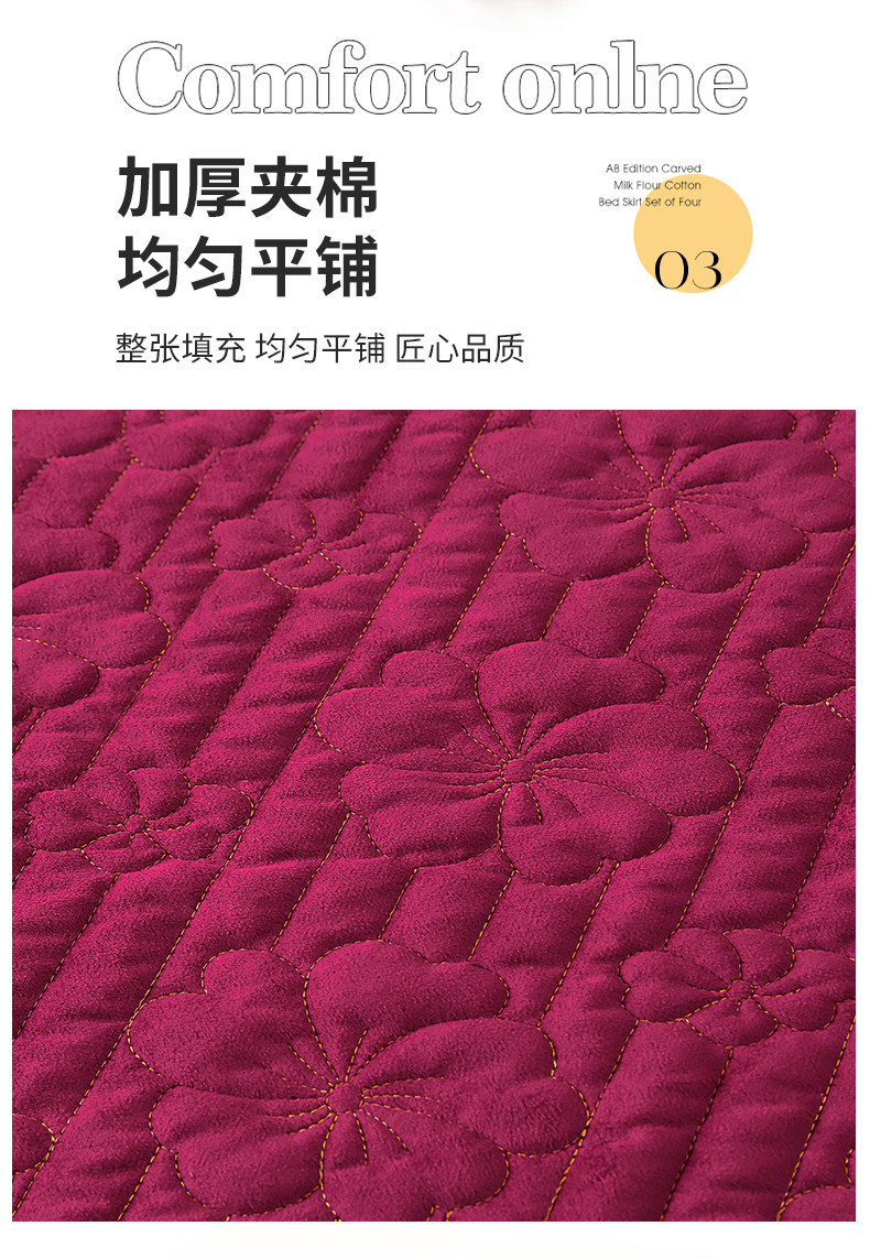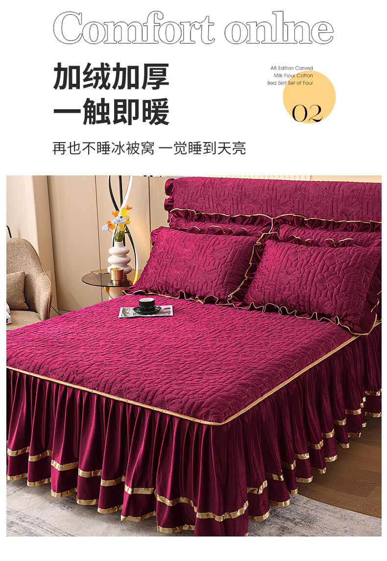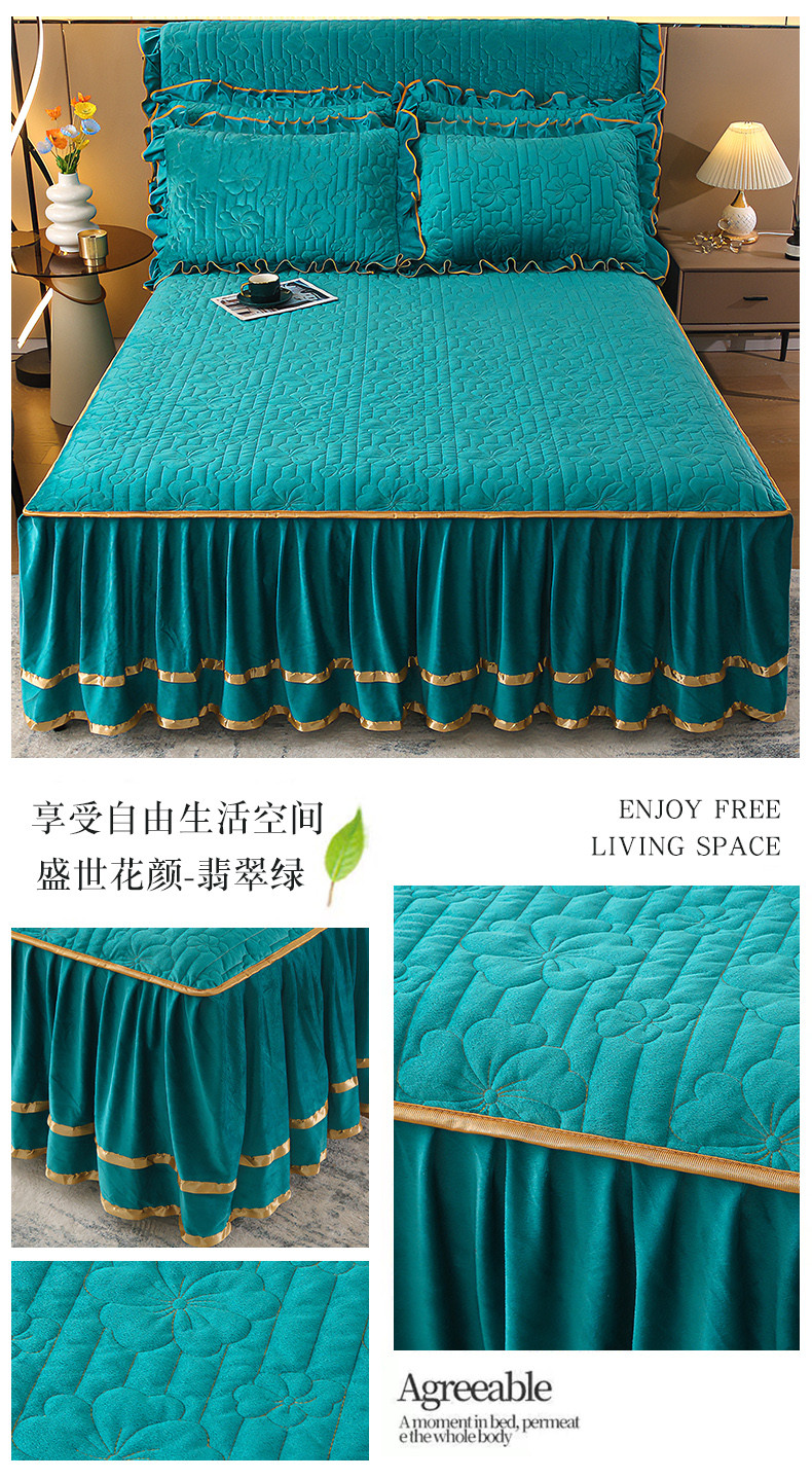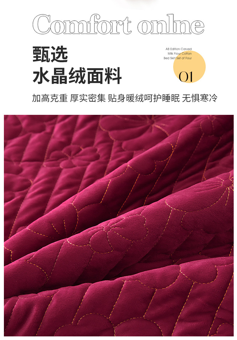 (总)屹成家纺2025新款水晶绒夹棉绗缝床裙四件套(塞纳河畔)四件套起售价不低于230元,大红,豆沙,翡翠绿,粉玉,橄榄绿,蔚蓝,银灰