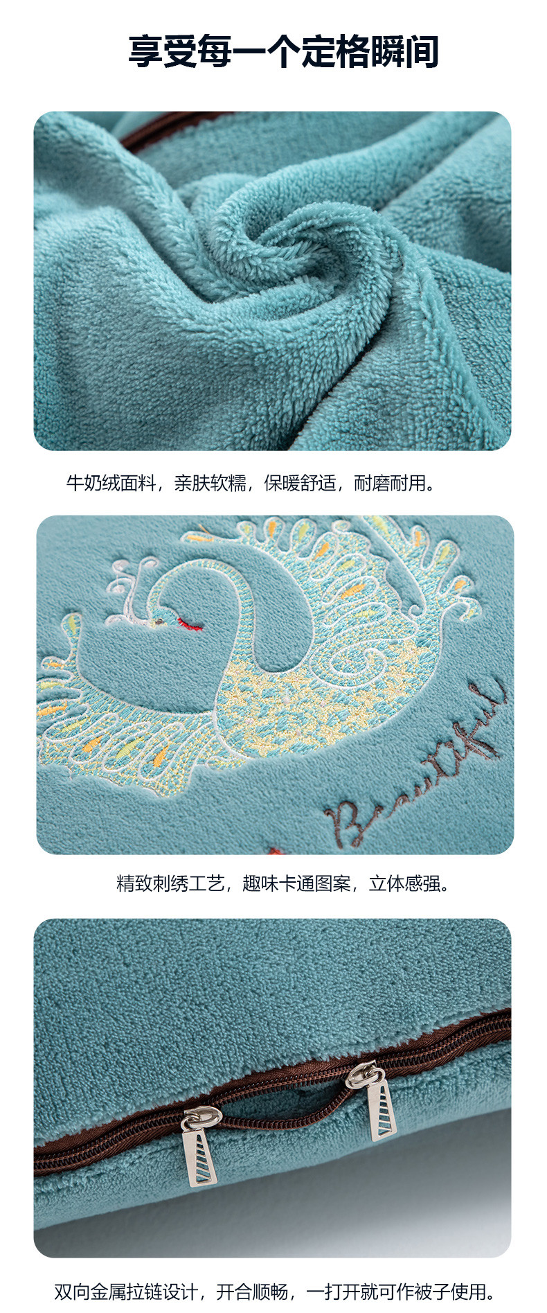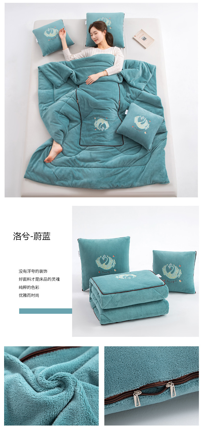 商品名称:翰轩家居 2023新款牛奶绒轻奢大牌风刺绣抱枕被 洛兮-蔚蓝