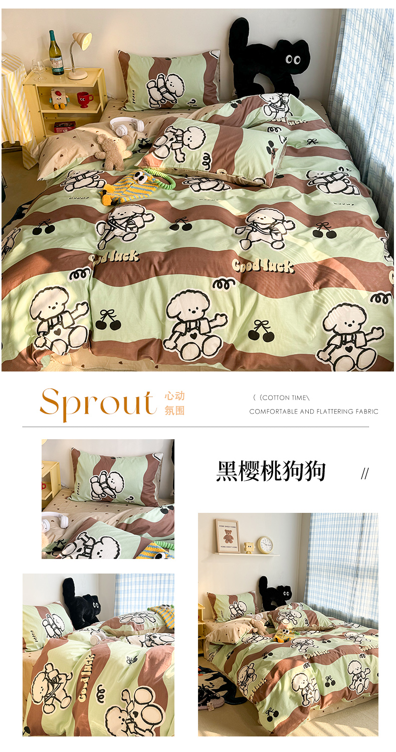 商品名称:昔可家纺 2024新款全棉萌趣卡通印花系列四件套 黑樱桃狗狗