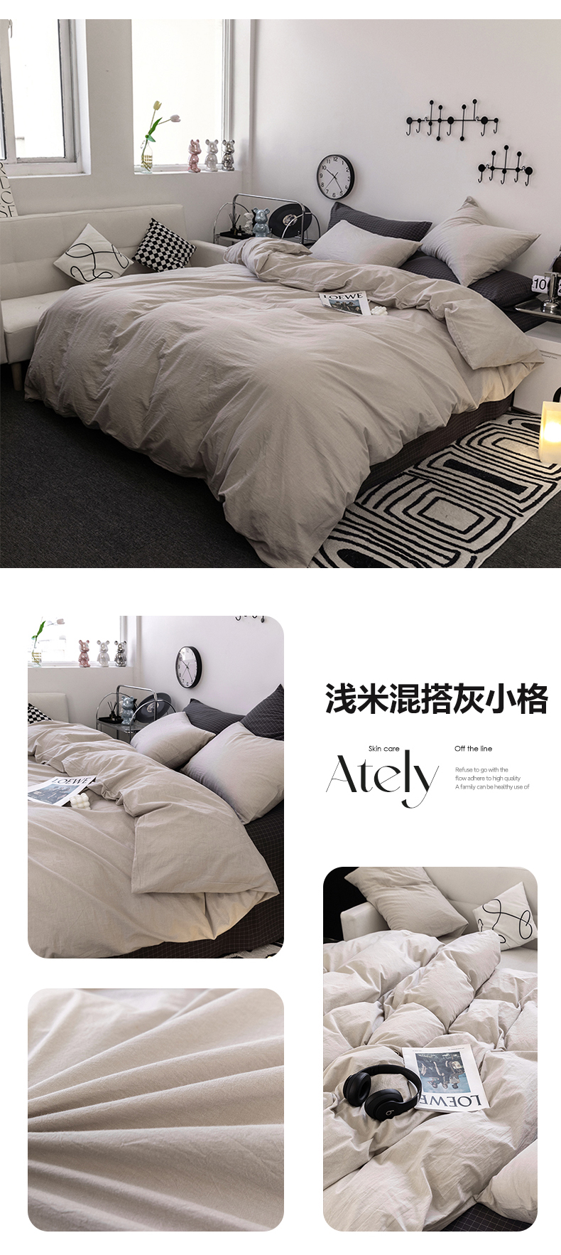 当前位置: 91家纺网 > 商品网购 > 床品套件 > 四件套 > 全棉普通四件套 > 羋多(原穆琪) 2024新款A类全棉色织水洗棉纯色四件套 浅米混搭灰小格