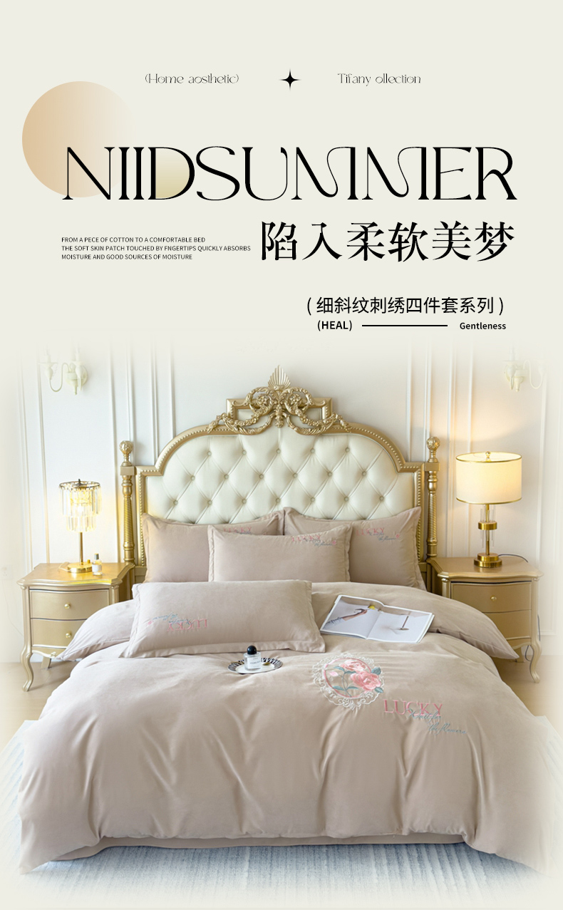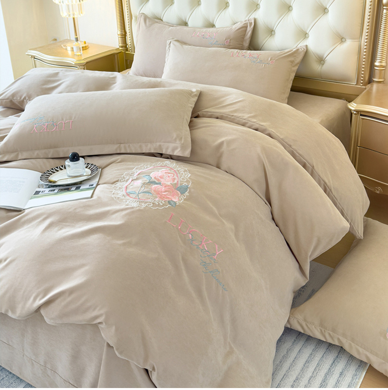 鑫利来家纺 2024新款水洗斜纹棉蛋白棉绣花磨毛四件套 爱丽丝-香槟色