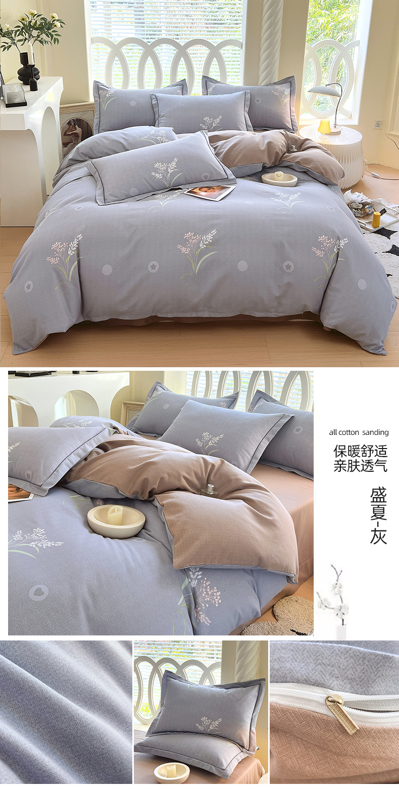 当前位置: 91家纺网 > 商品网购 > 床品套件 > 四件套 > 全棉普通四件套 > 威布斯家居 2024新款AB版全棉生态磨毛四件套 盛夏-灰
